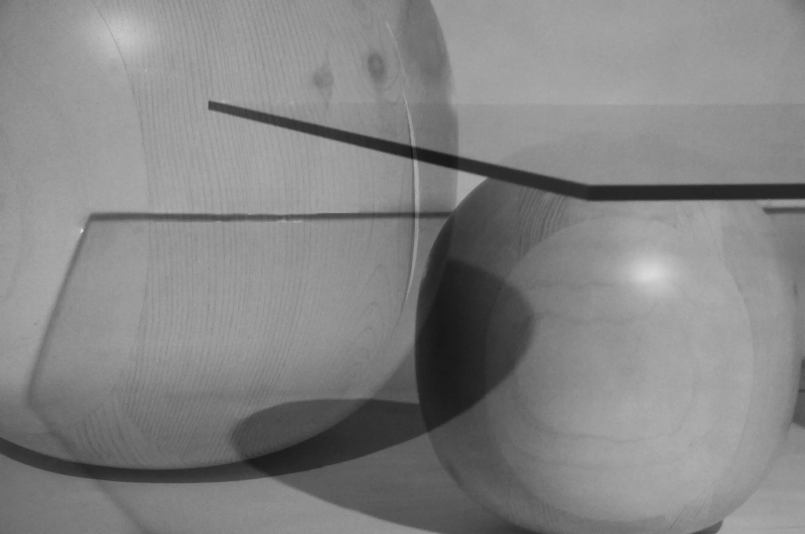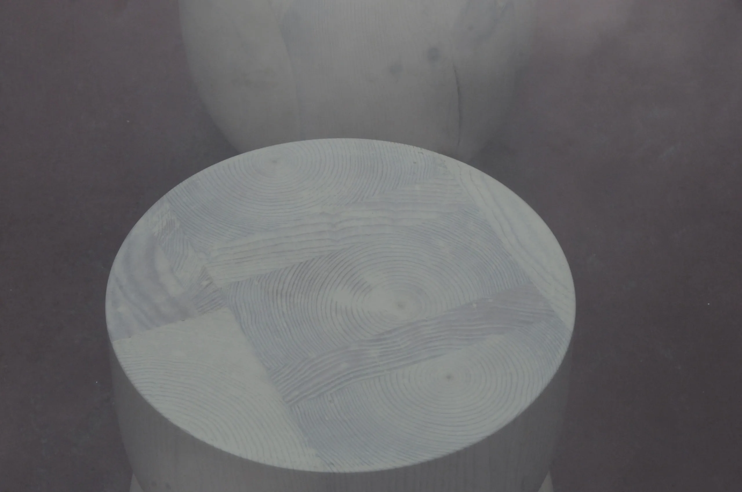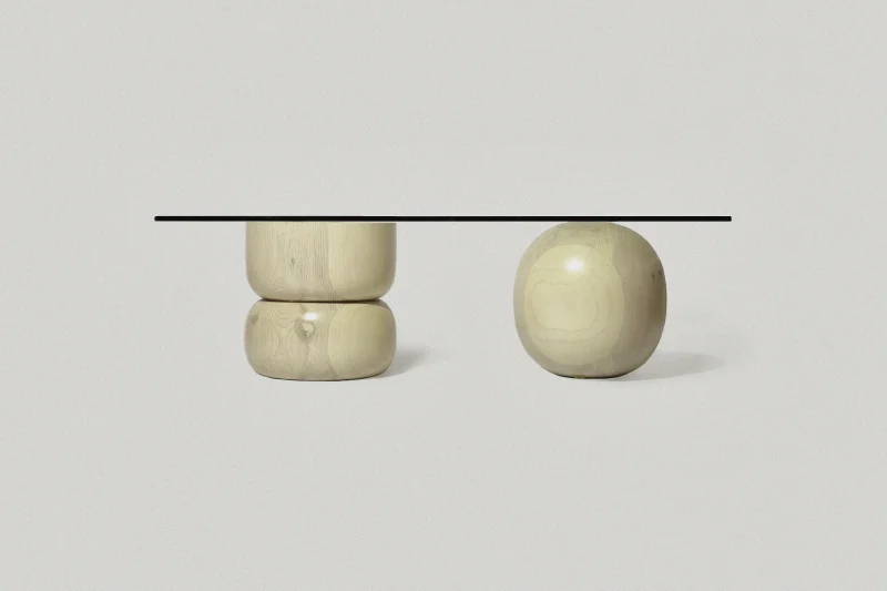 A simple glass surface sustained by two hand-turned wood pieces with a stunning semi-matte glazing.