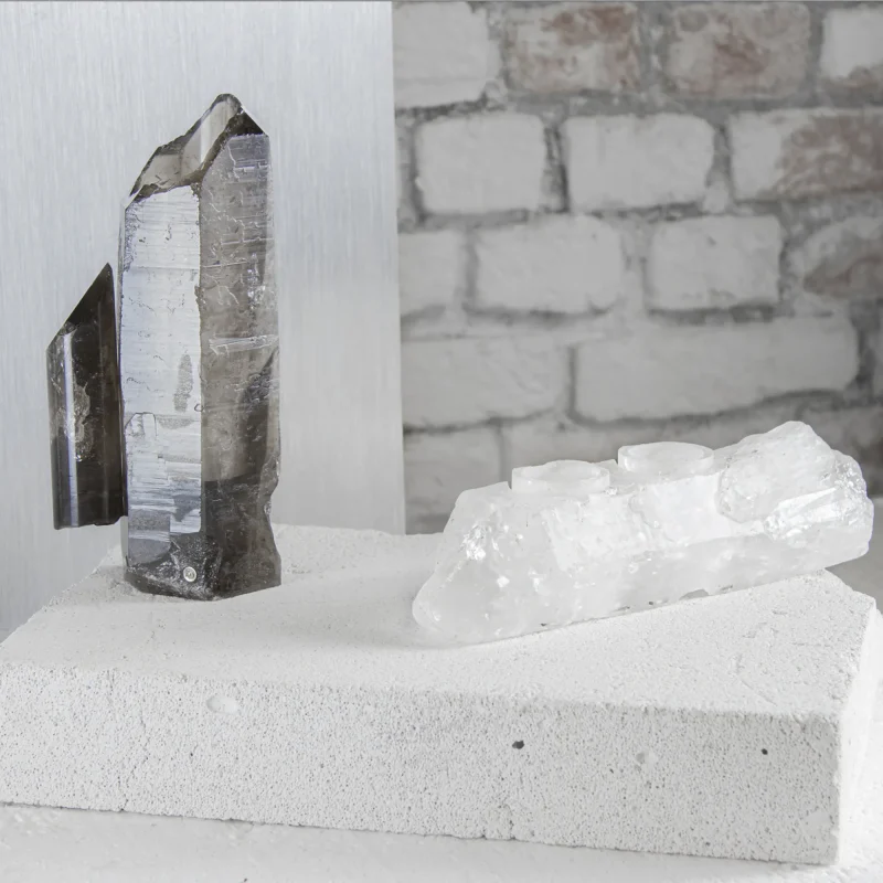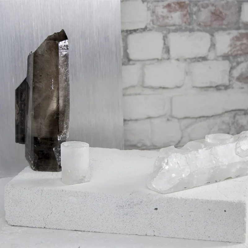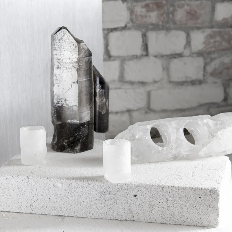 This luxurious elegant set is made of natural crystals. Smoky & Rock crystal. The shot glasses are accompanied by the stone of their origin, which functions as their carrier or holder.