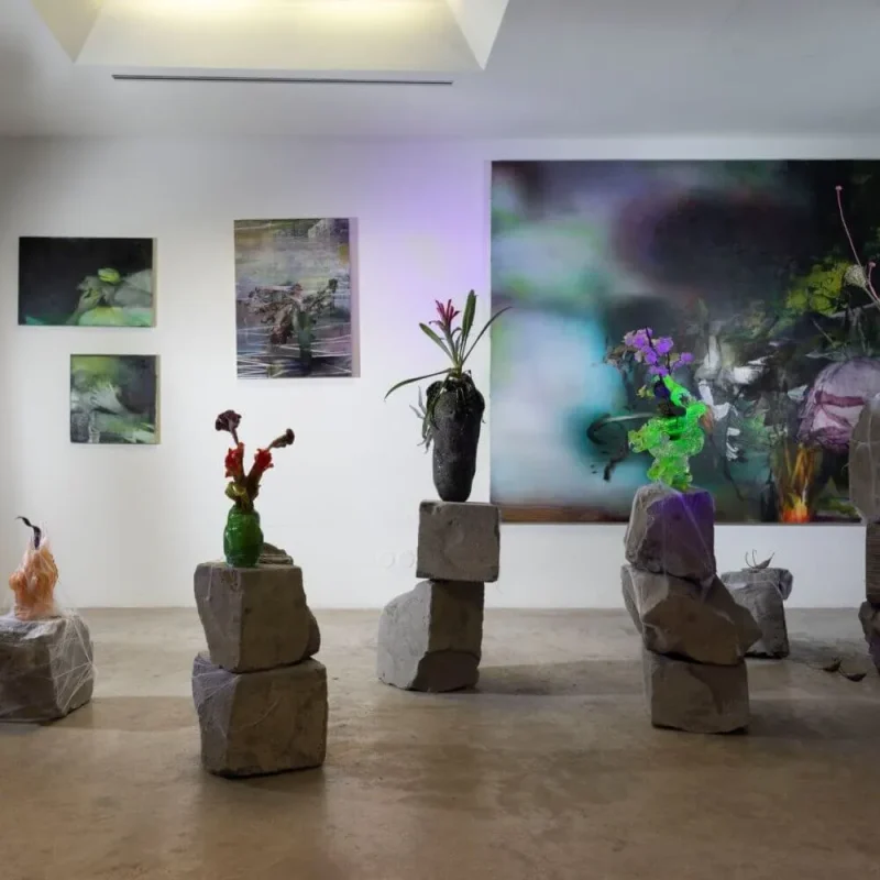 uranium glass, crystal, hand shaped, live plant