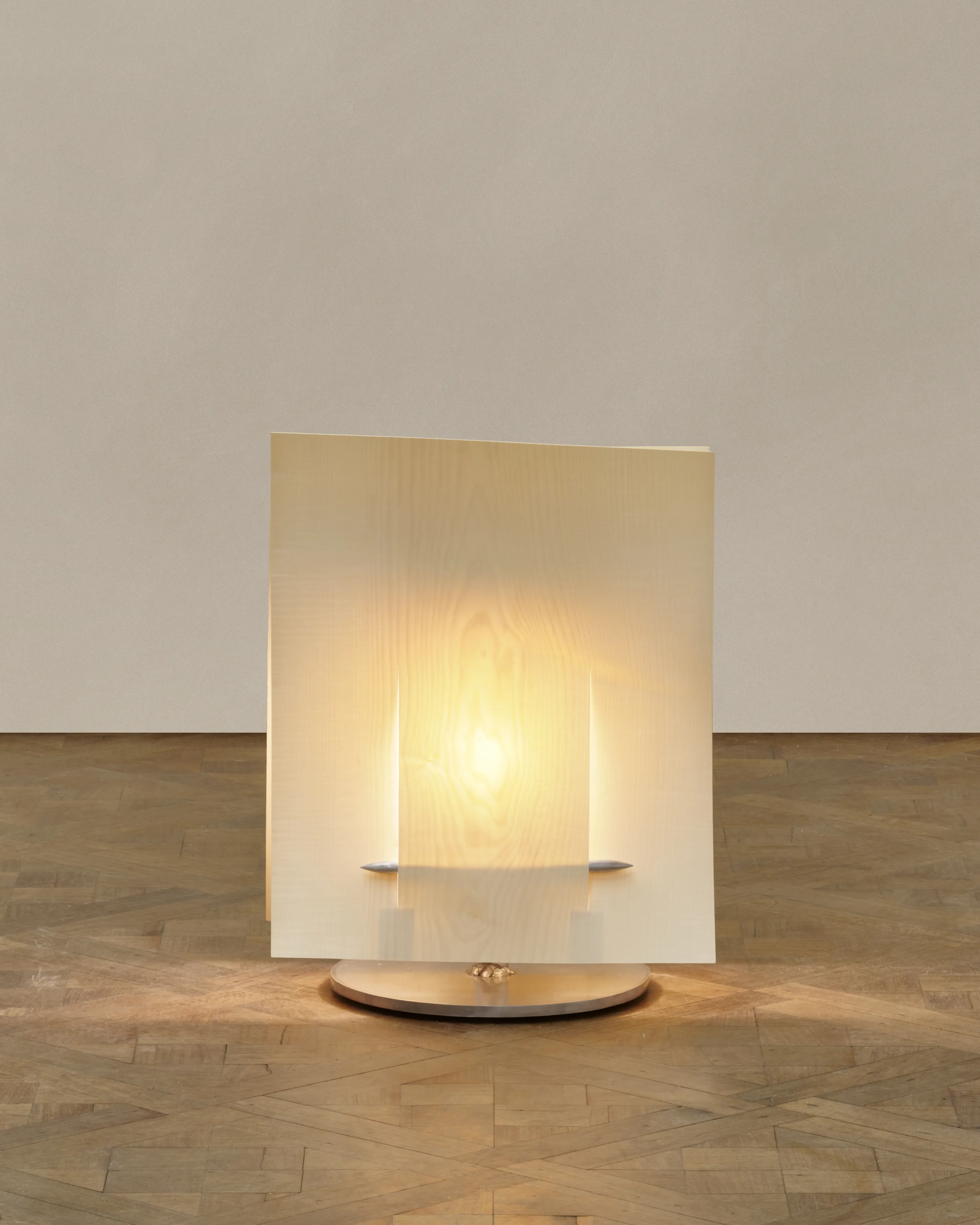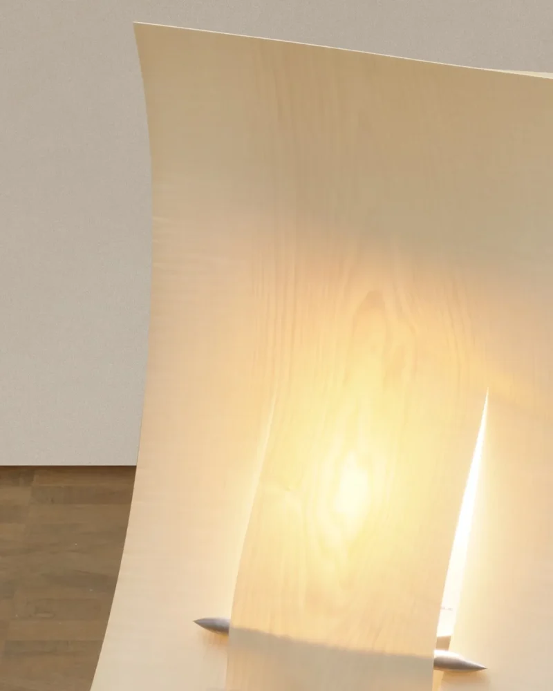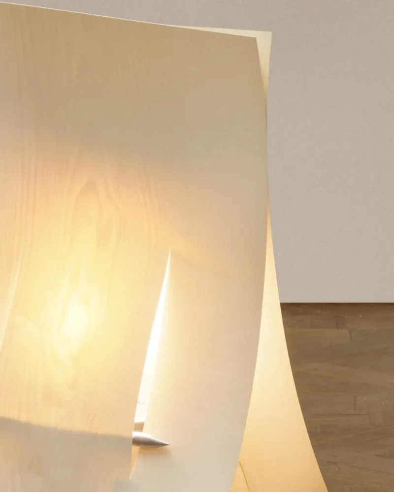 The Soft Ply lamps transform delicate veneer into a resilient, sculptural form. Each shade is crafted from birch veneer, precisely cut like textile or paper craft. What begins as a fragile material gains surprising strength through pattern and structure, creating a surface that feels both intricate and enduring. Resting on a minimal aluminium base, the lamp offers a warm, tactile presence that brings craft, material innovation, and quiet elegance into the home.
