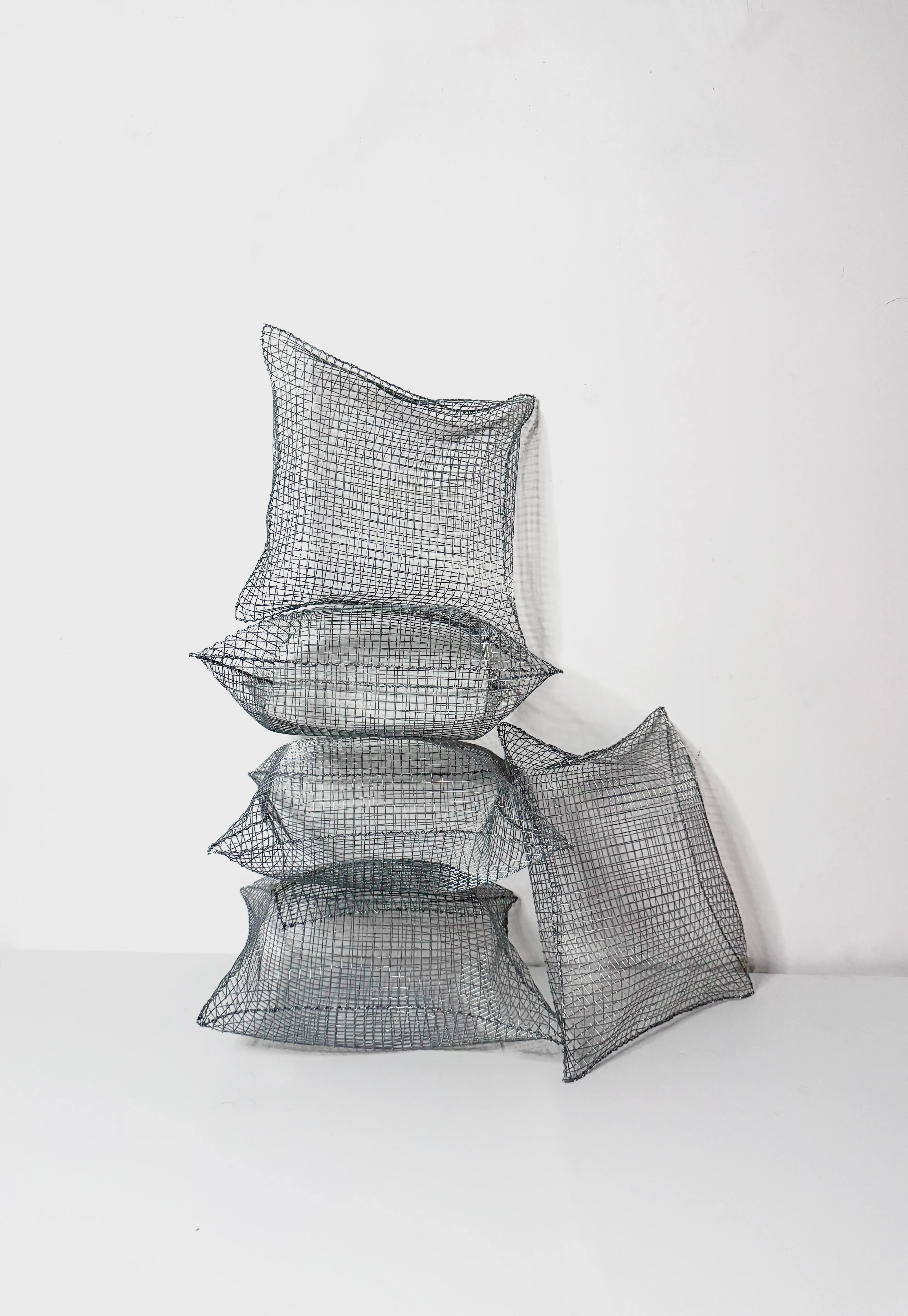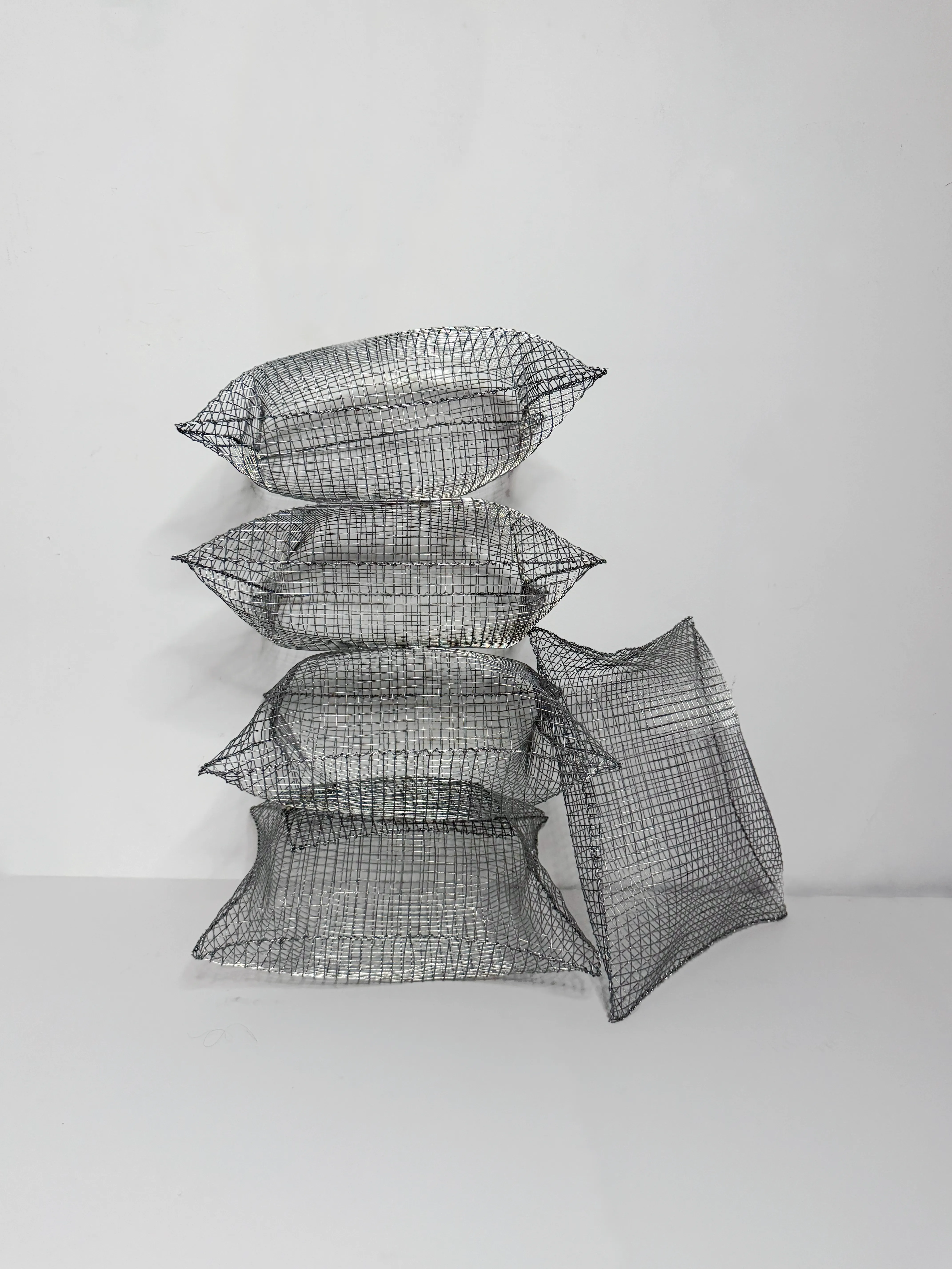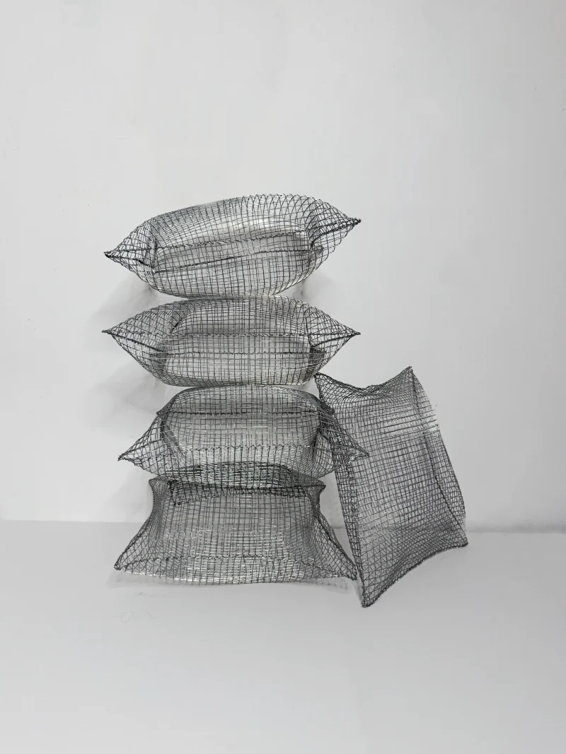 The metal mesh pillows reinterpret a familiar object through an unexpected material. Made from galvanized metal mesh and carefully shaped by hand, each piece captures the soft volume of a pillow while remaining rigid and structural.