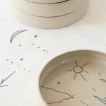 The drawings trigger the imagination of the person eating from the dish, drinking from the cup: the food slowly leaves space to a secret message an inscription, triggering memories, imagination.