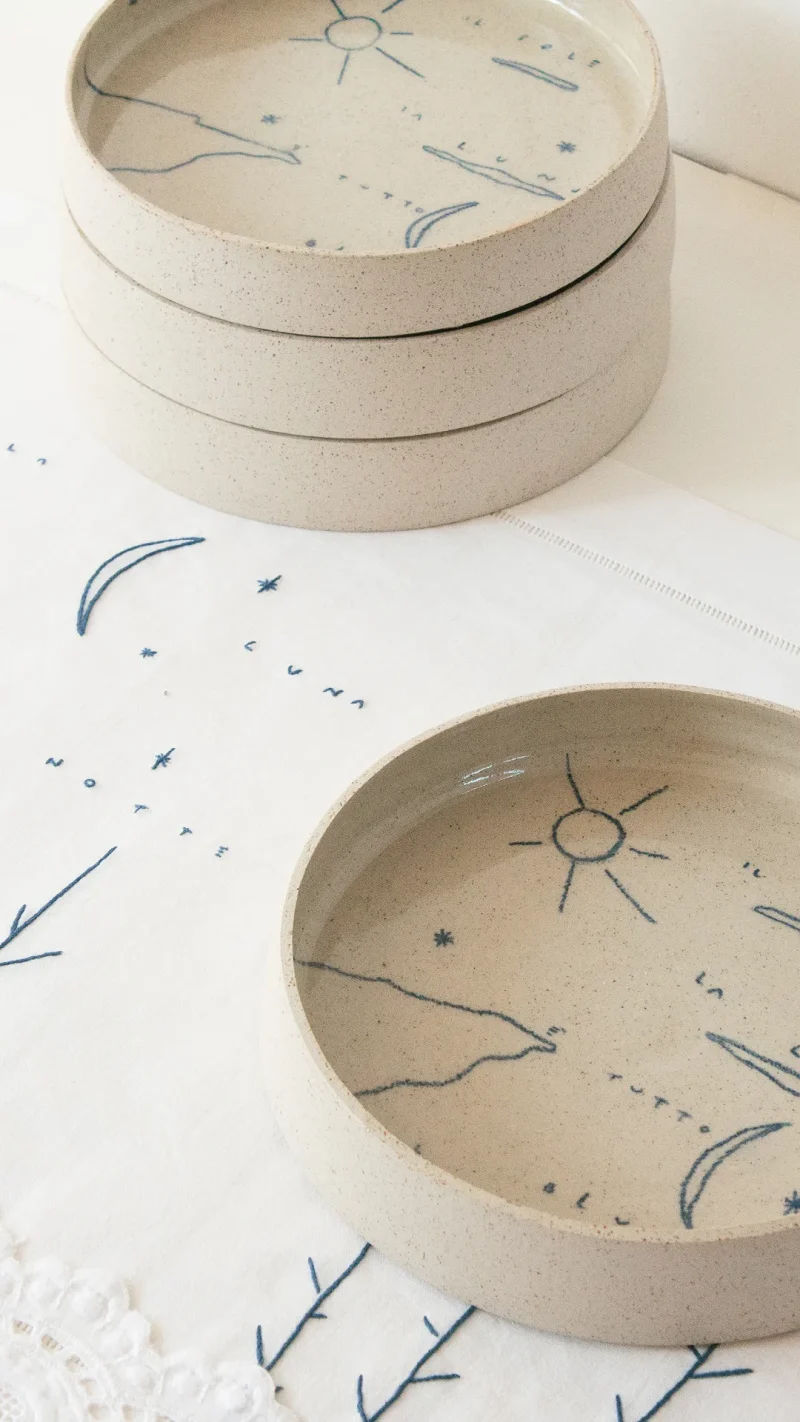 The drawings trigger the imagination of the person eating from the dish, drinking from the cup: the food slowly leaves space to a secret message an inscription, triggering memories, imagination.