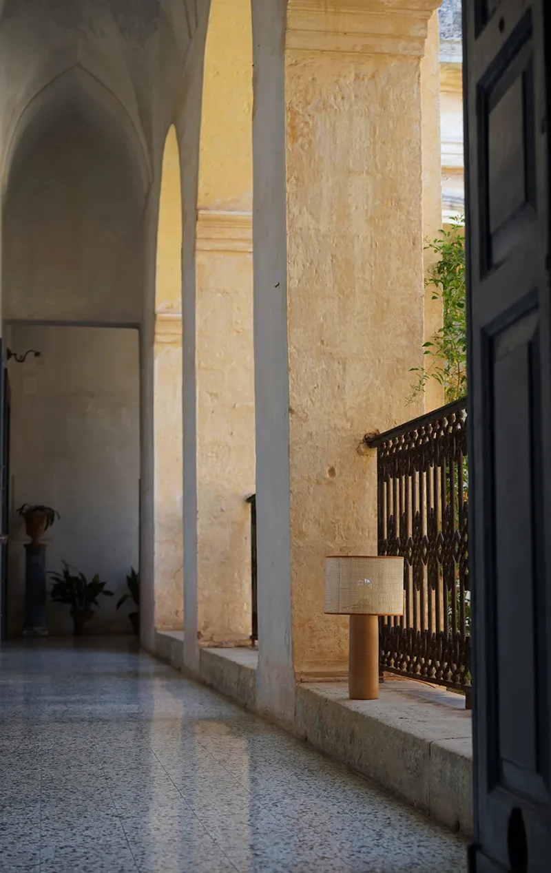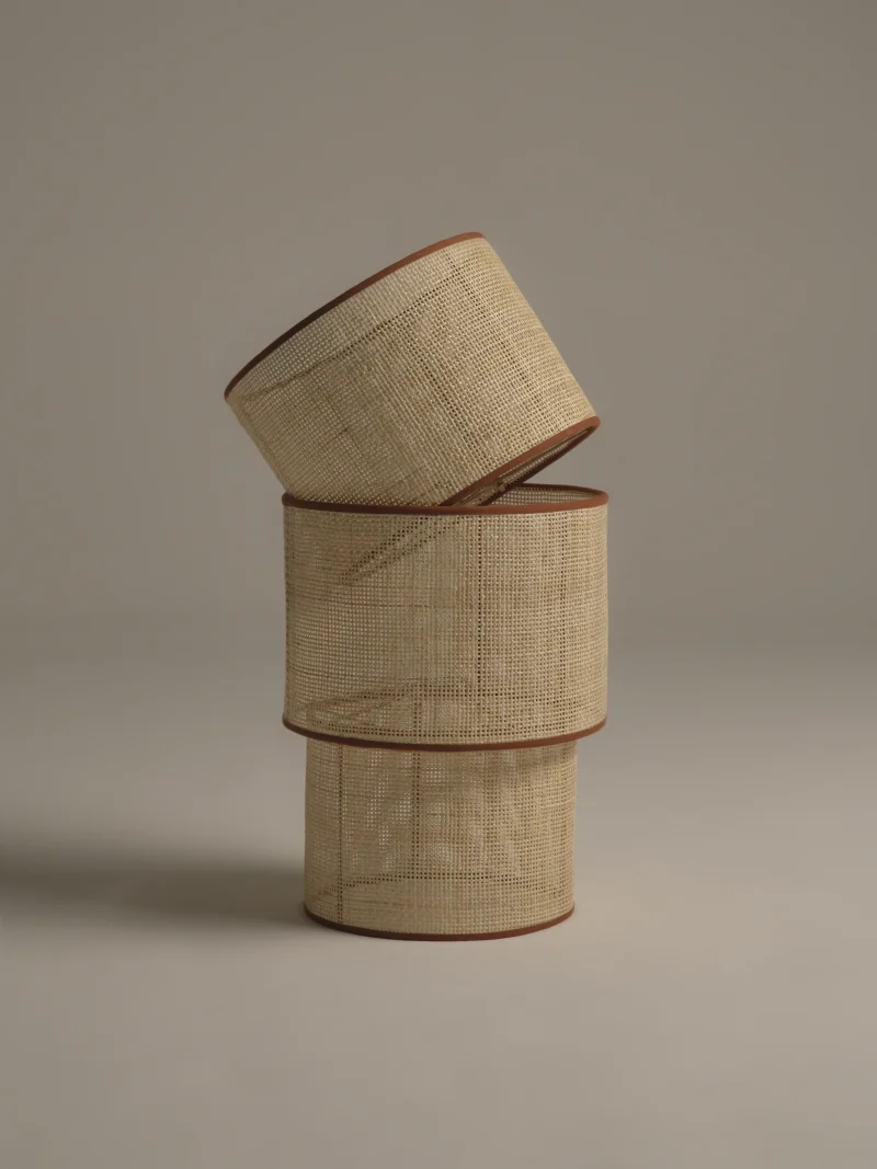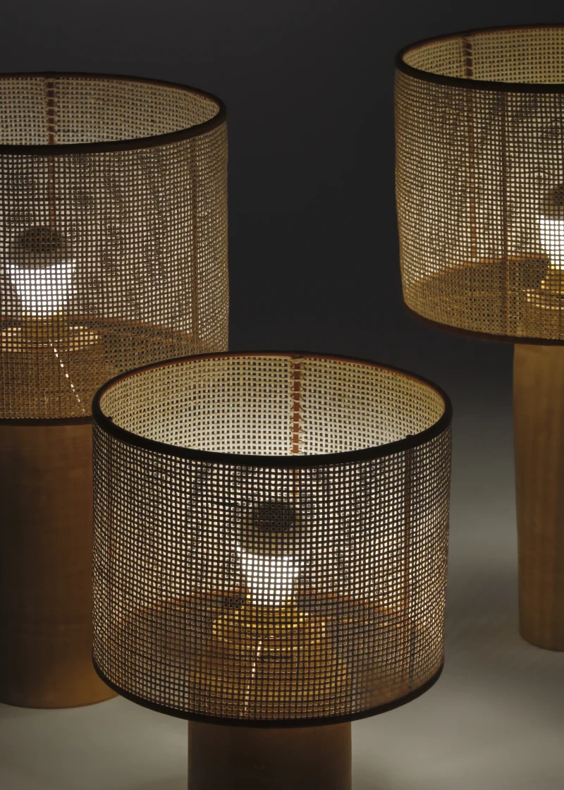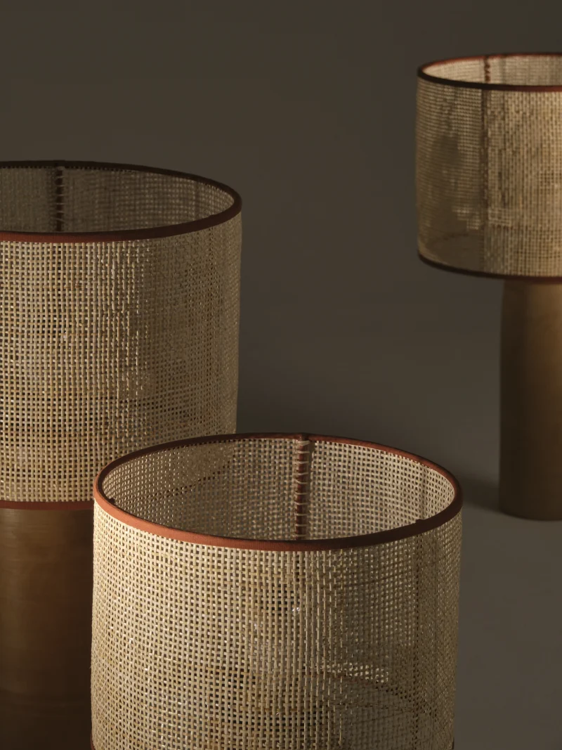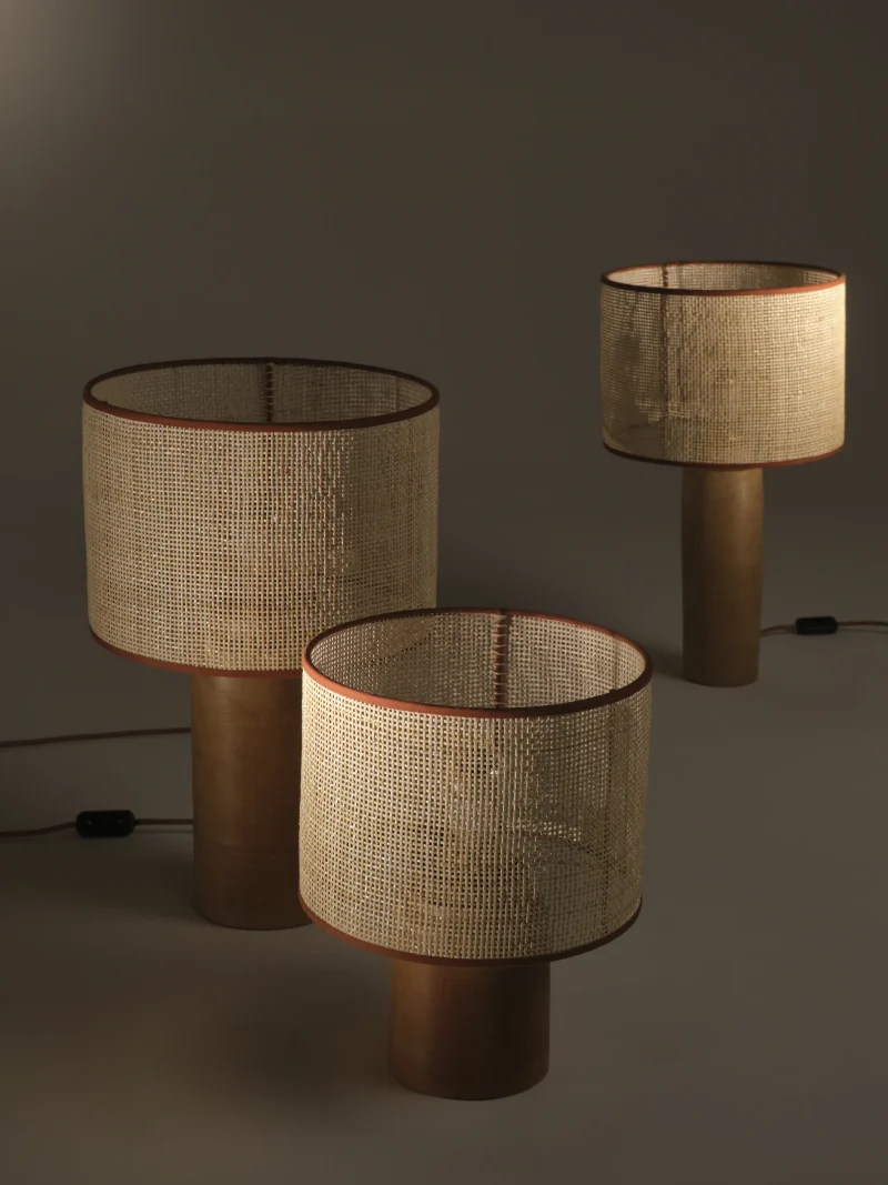 the rattan lampshades are finely crafted, completely hand-stitched and carefully finished without the use of plastic. The base is made of turned terracotta, baked using the ancient technique of the wood-burning oven, carefully polished and waxed with natural waxes.