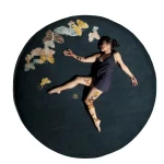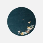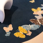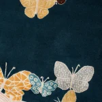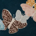 Hand-drawn butterflies seem to come out of the floor. The background is wool, while the butterflies are made with a silk thread.