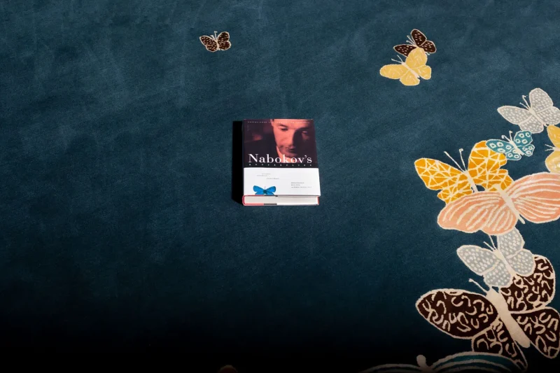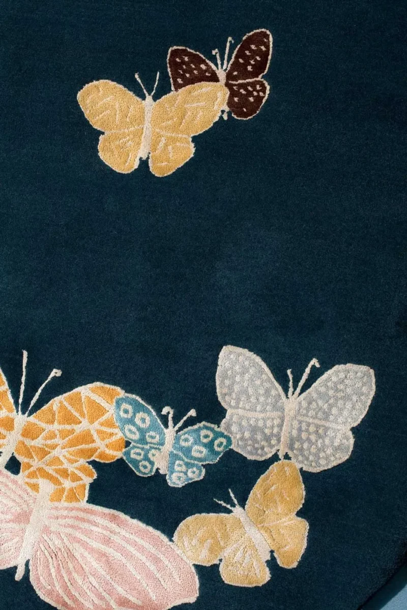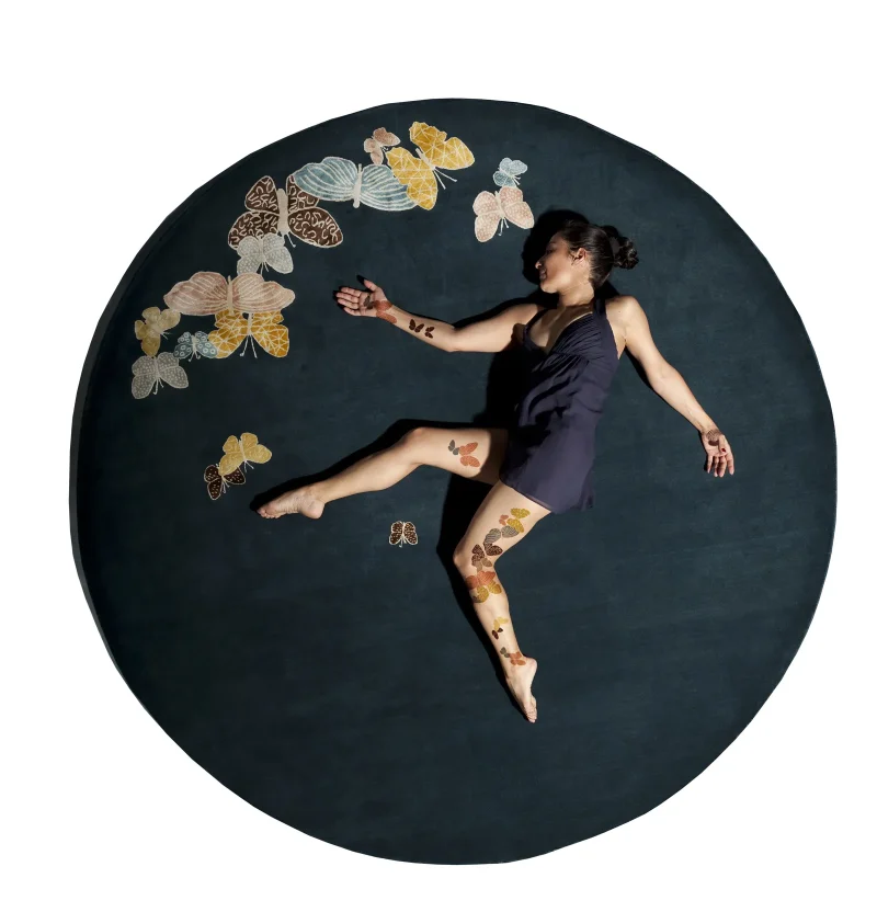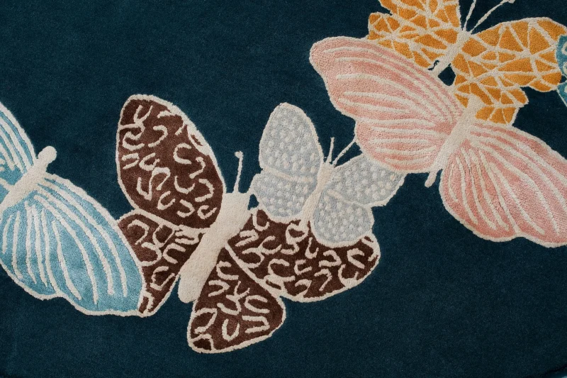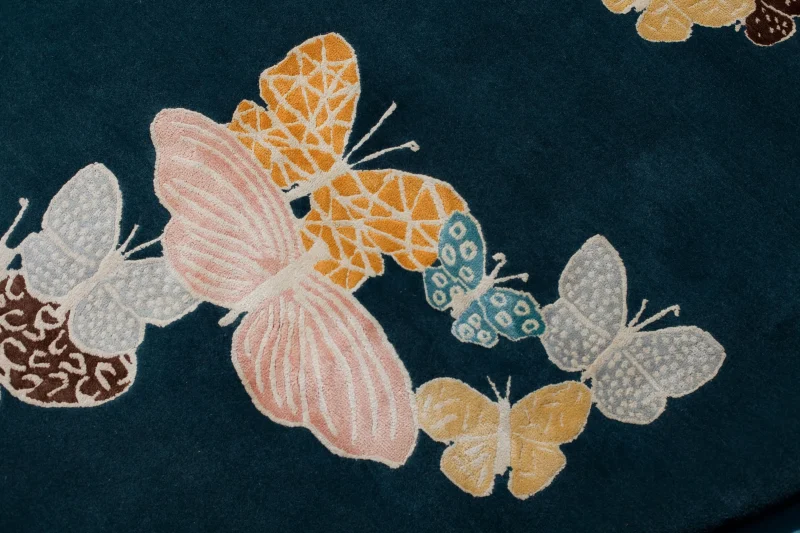Hand-drawn butterflies seem to come out of the floor. The background is wool, while the butterflies are made with a silk thread.