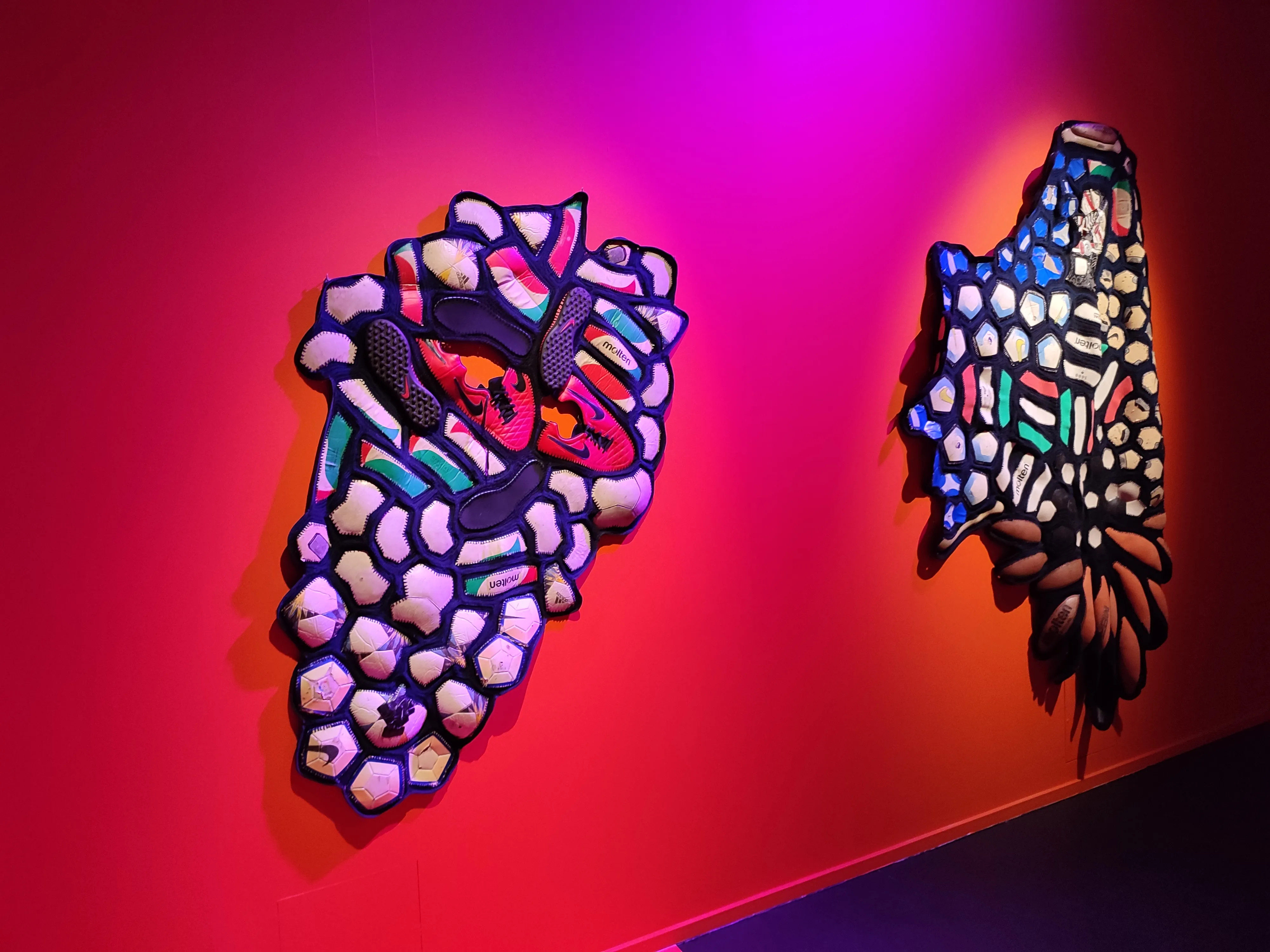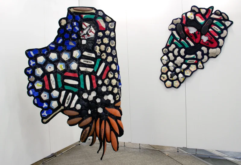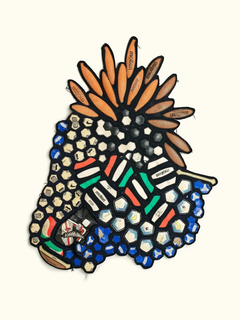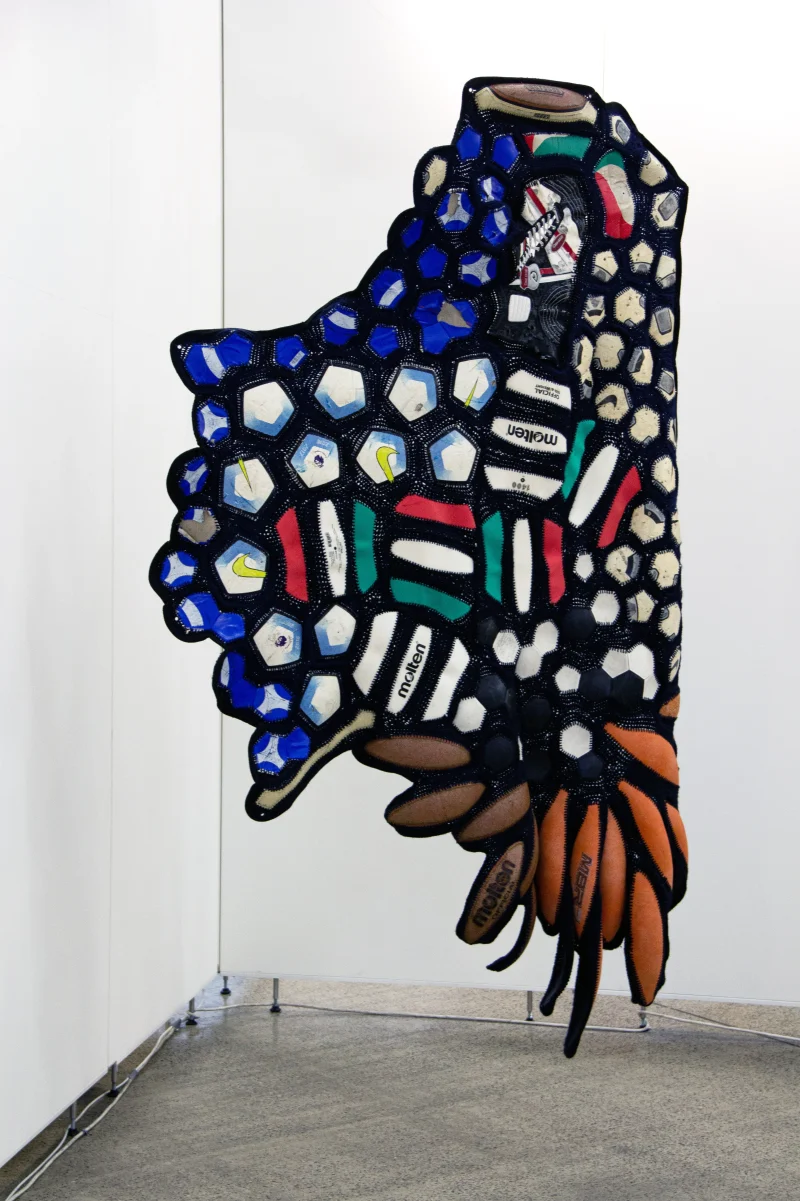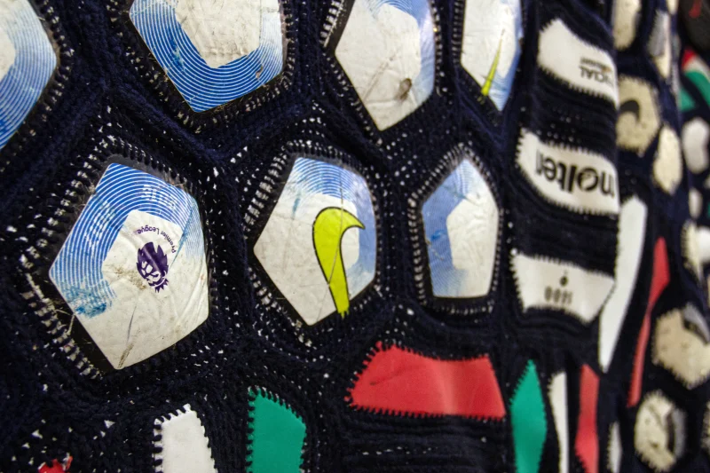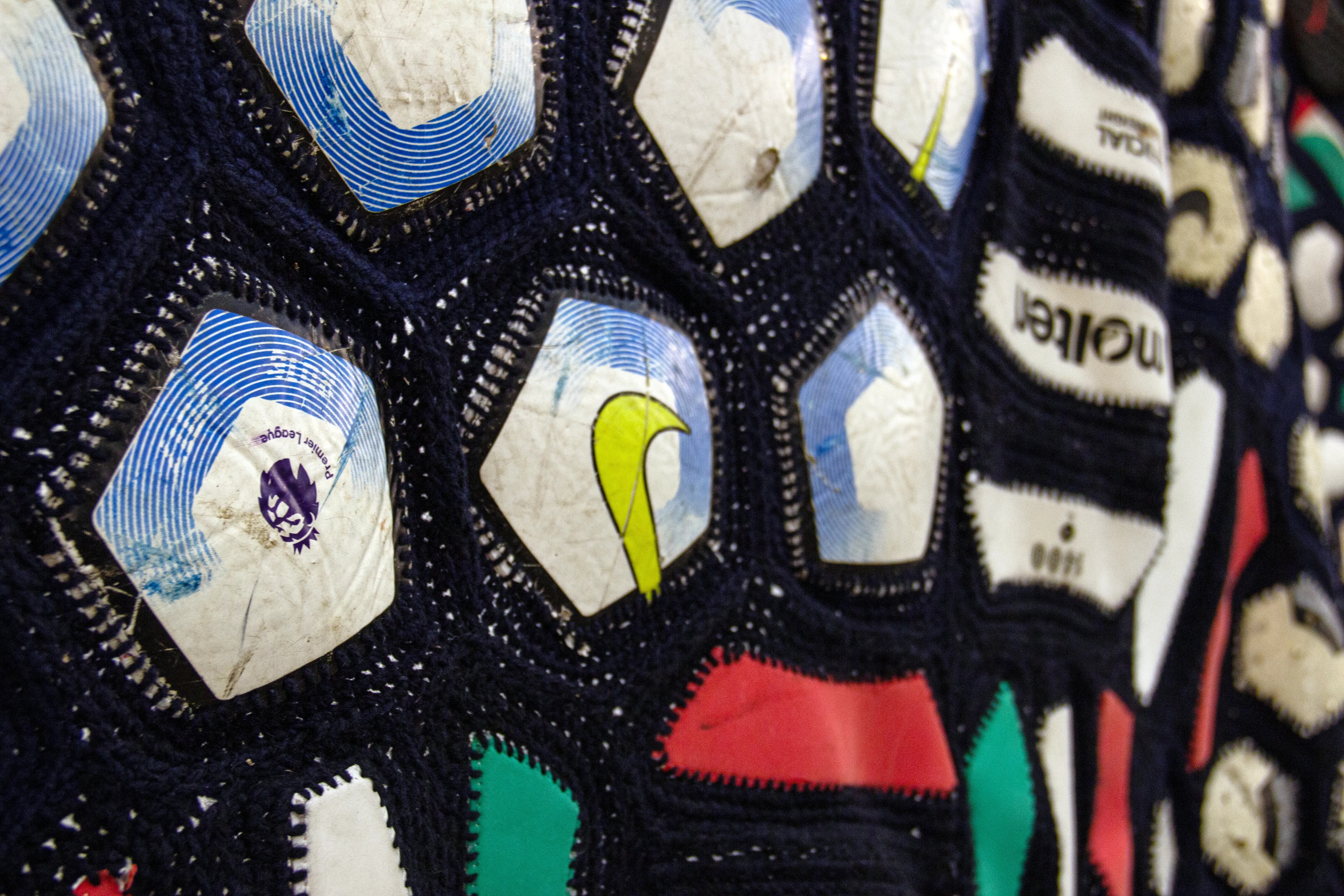 All the objects from this series have been created from difficult items related to sports: basketballs and footballs, sports trainers, and socks, etc. Everything not to be used during the #stayathome period. Most of the objects used in the installation was the equipment for team sports that became redundant when the training was moved to the indoors and on the carpet. Therefore, the appearance of textile in this work is a conceptual reference to the absurdity of the indoor sports (on the carpet).