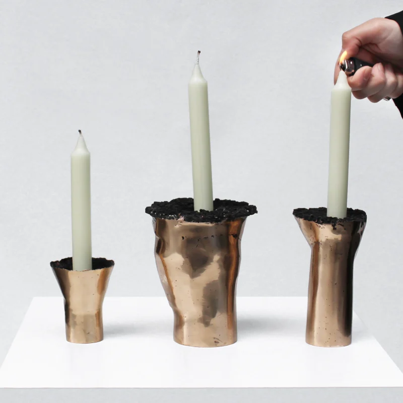 Sprue Candlesticks are produced by hand-shaping the sand during production, without adhering to a certain model, so the organic shape of each element is defined as sole and unrepeatable.