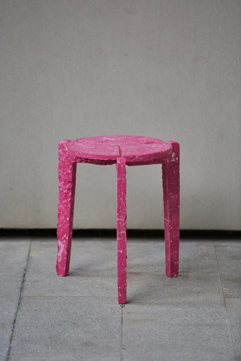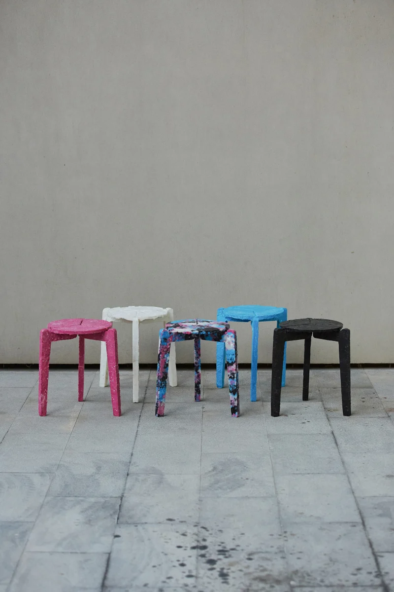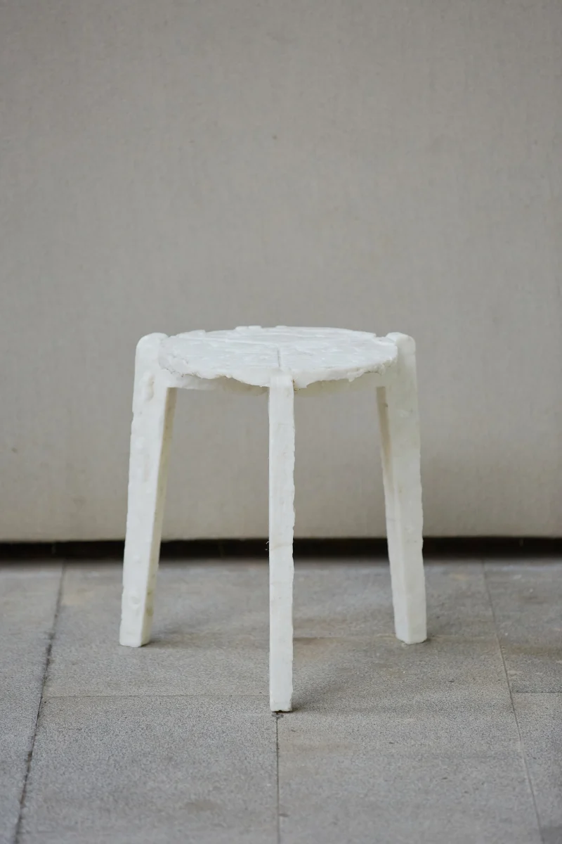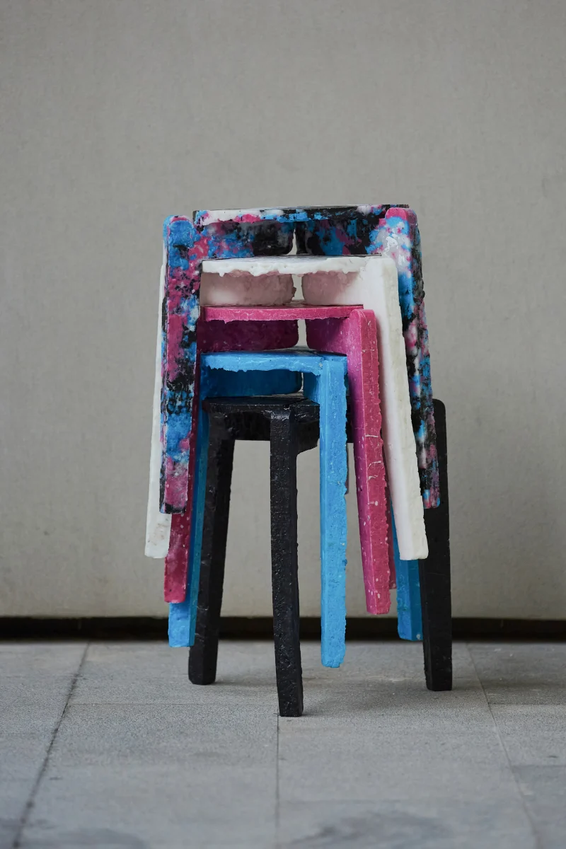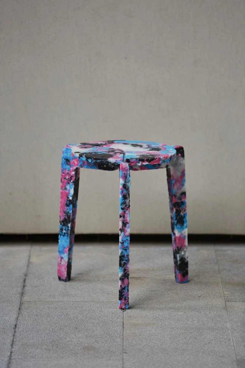 Due to the COVID-19 pandemic, the demand for masks and the waste have increased exponentially. While plastic masks protected human lives, they eventually turned into microplastics, posing a threat to marine life. In the shape of a stool, the plastic masks are melted down and cooled to harden again. Thousands of thin masks are combined and upcycled to form a hard and tough durability of plastic material.