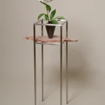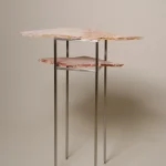 Brushed stainless steel profiles and unique sunset pink marble and pink limestone.