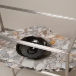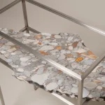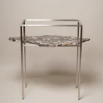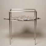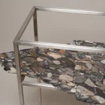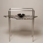 Crafted by Georgiev Zabeta in Sofia, Bulgaria, this console table seamlessly merges brushed stainless steel with distinctive metamorphic rock. Capturing a minimalist design, the piece subtly integrates biophilic elements and Art Deco influences. Its adjustable feet ensure both practicality and stability, while the reversible feature of the metamorphic rock offers versatility. Presenting a polished surface on one side and a rough texture on the other, this table allows for diverse aesthetic expressions in any space.