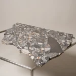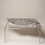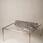 Crafted by Georgiev Zabeta in Sofia, Bulgaria, this low coffee table seamlessly merges brushed stainless steel with distinctive metamorphic rock. Capturing a minimalist design, the piece subtly integrates biophilic elements and Art Deco influences. Its adjustable feet ensure both practicality and stability, while the reversible feature of the metamorphic rock offers versatility. Presenting a polished surface on one side and a rough texture on the other, this table allows for diverse aesthetic expressions in any space.