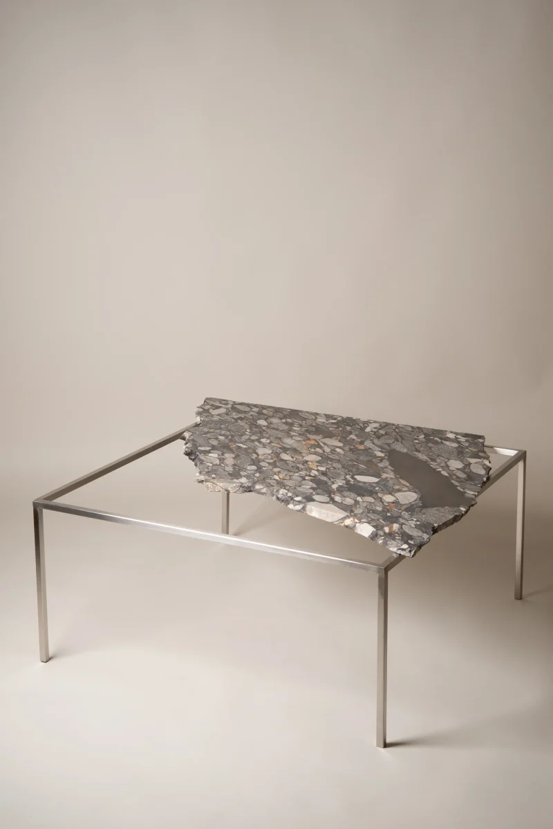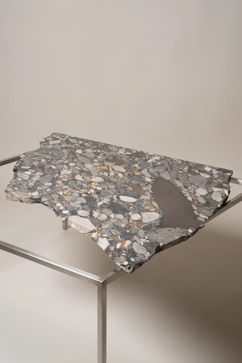 Crafted by Georgiev Zabeta in Sofia, Bulgaria, this low coffee table seamlessly merges brushed stainless steel with distinctive metamorphic rock. Capturing a minimalist design, the piece subtly integrates biophilic elements and Art Deco influences. Its adjustable feet ensure both practicality and stability, while the reversible feature of the metamorphic rock offers versatility. Presenting a polished surface on one side and a rough texture on the other, this table allows for diverse aesthetic expressions in any space.