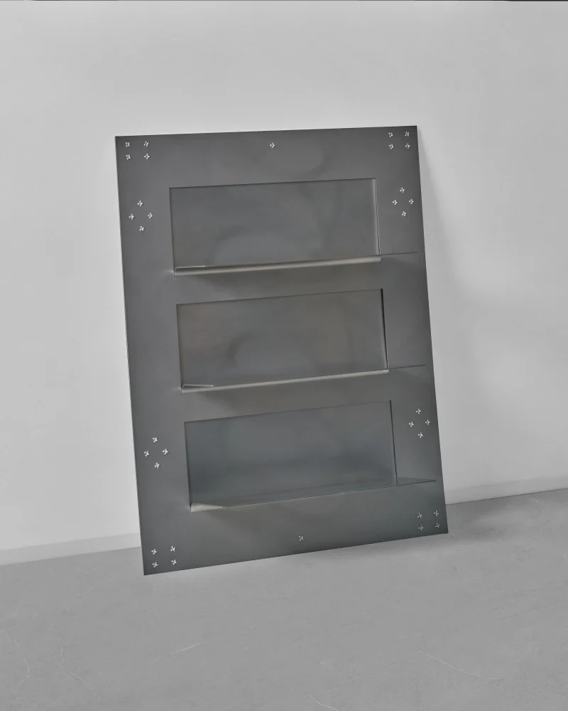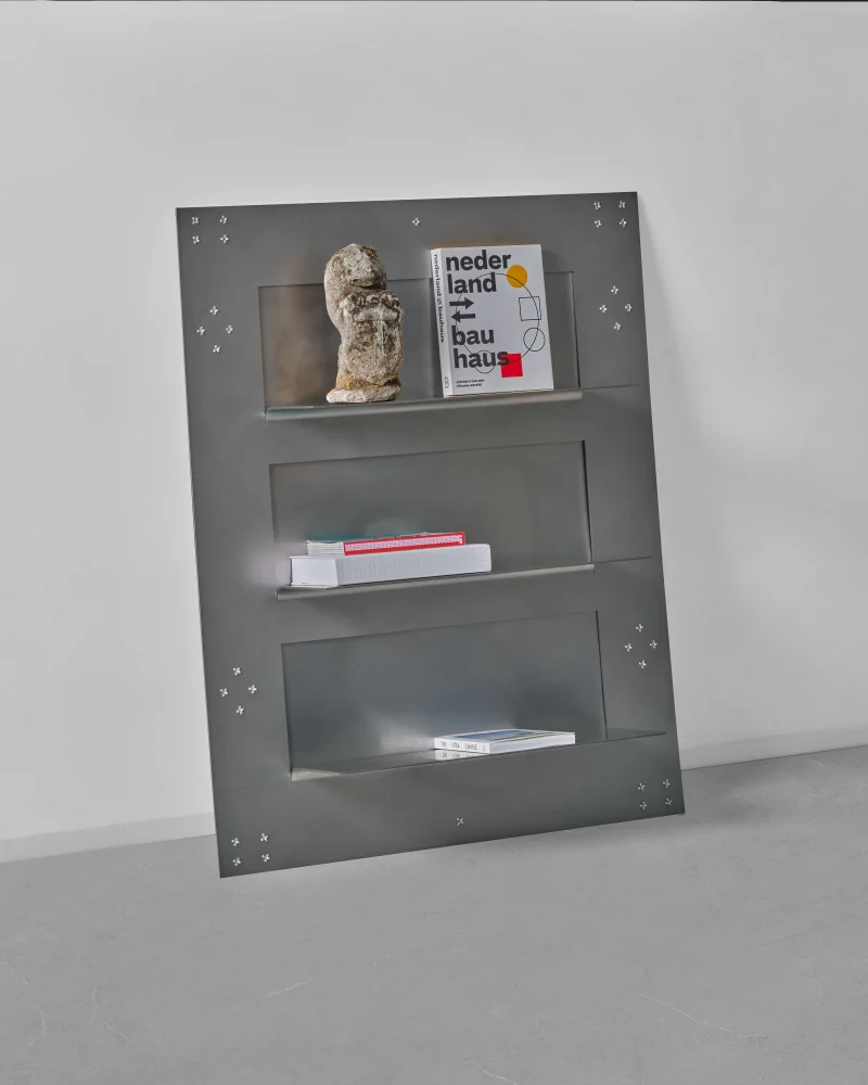 This Bookshelf by 304.cage is formed from two pieces of stainless steel: laser-cut and bent to create the shelves. Special flower rivets are used to hold the two plates together.