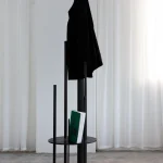 The STANDING HANGER doubles as a sculpture, embodying PRACTICE’s commitment to functional art. Crafted from black-painted steel, it serves as a sculptural free-standing hanger for clothes and as a side table for books or small items. When not in use, its sculptural form enhances the space as a decorative object. Minimalist yet impactful, the STANDING HANGER is a testament to PRACTICE’s ability to blend utility with aesthetic appeal.
