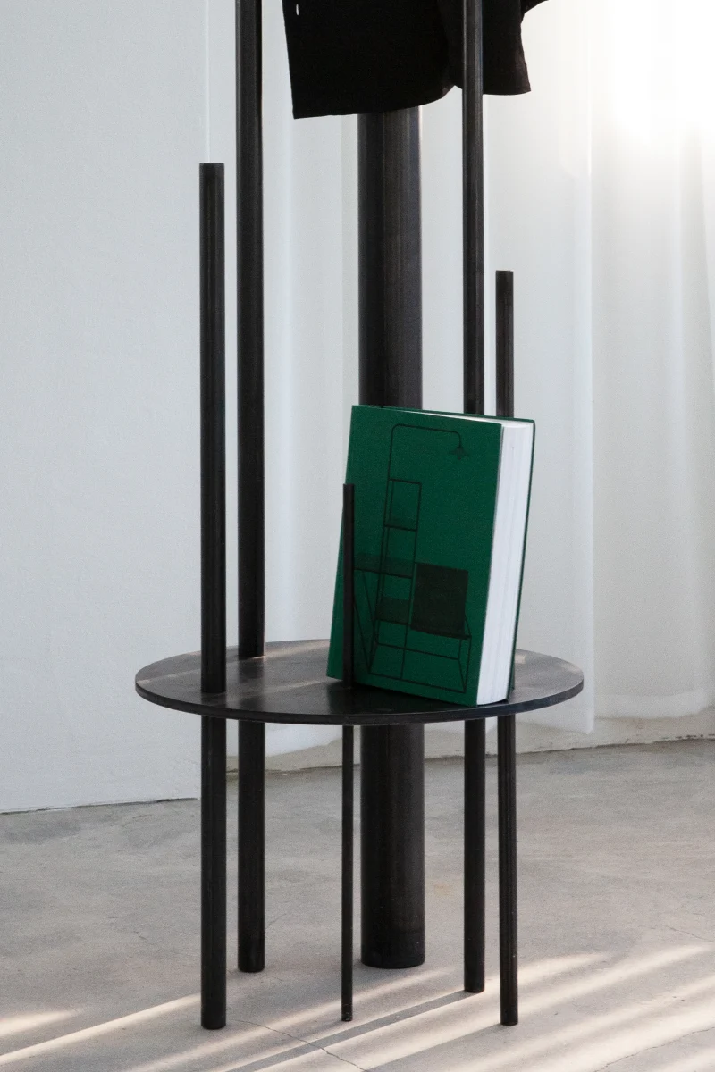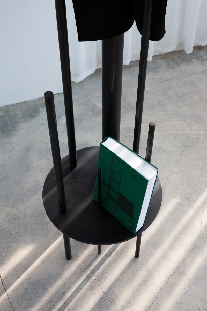 The STANDING HANGER doubles as a sculpture, embodying PRACTICE’s commitment to functional art. Crafted from black-painted steel, it serves as a sculptural free-standing hanger for clothes and as a side table for books or small items. When not in use, its sculptural form enhances the space as a decorative object. Minimalist yet impactful, the STANDING HANGER is a testament to PRACTICE’s ability to blend utility with aesthetic appeal.