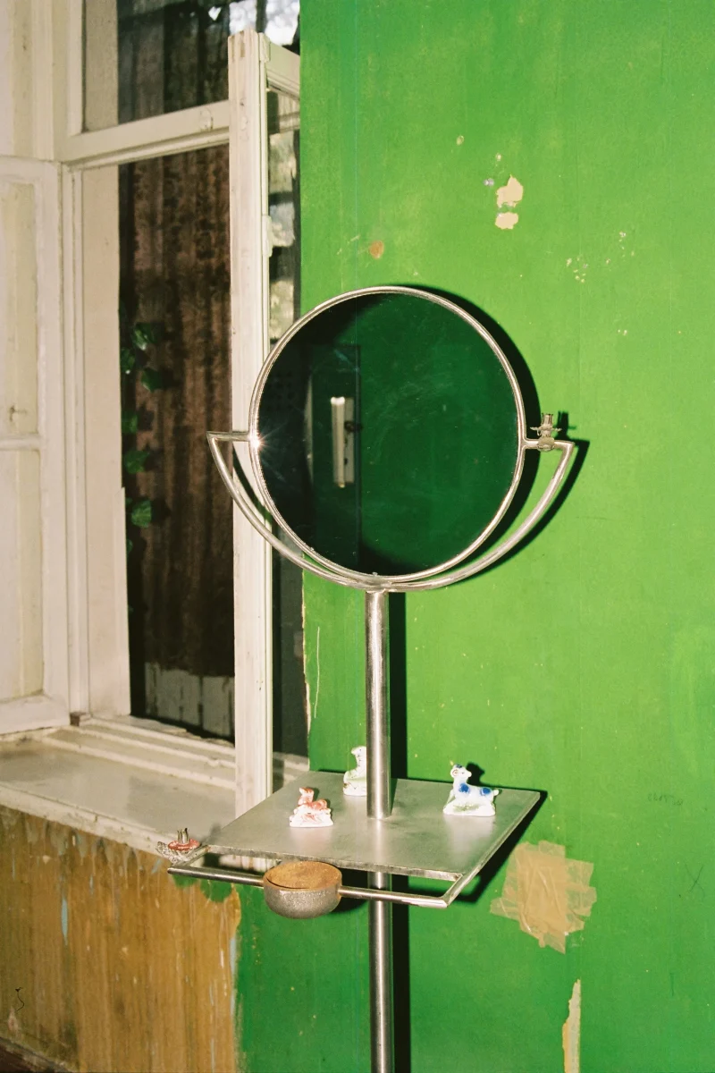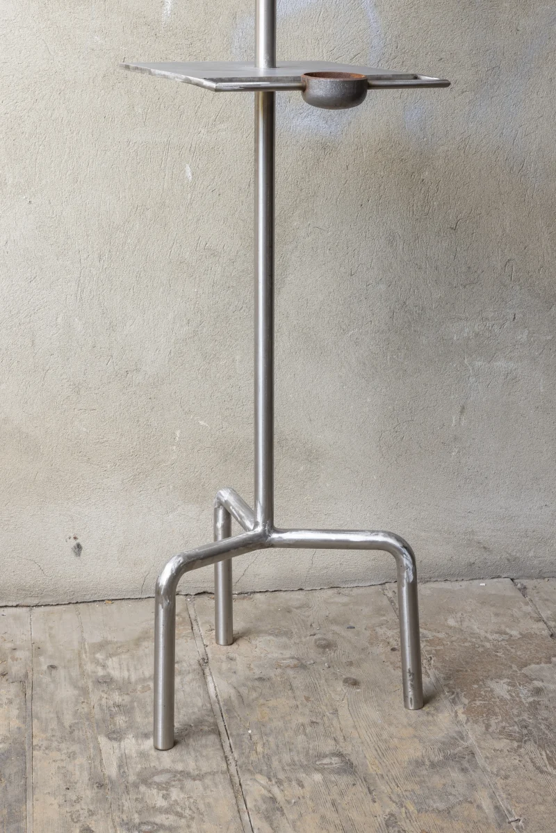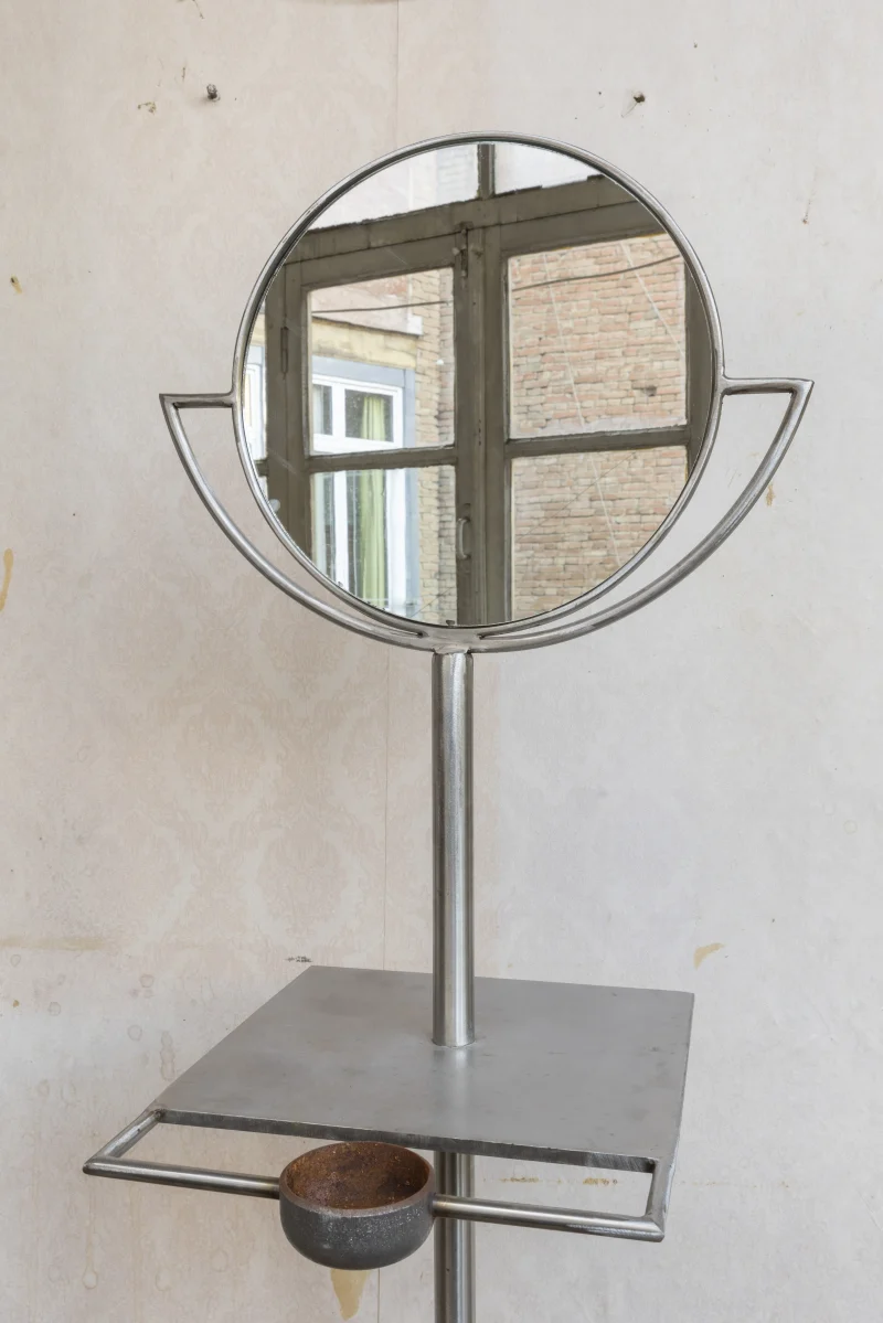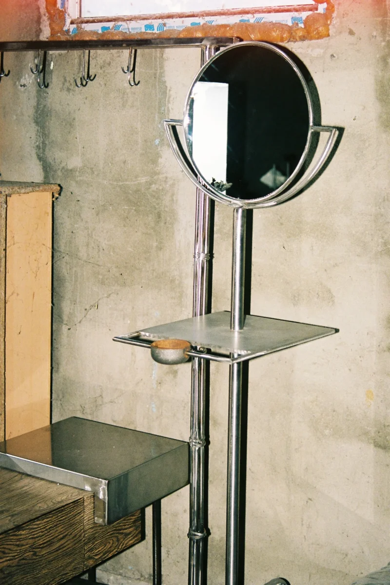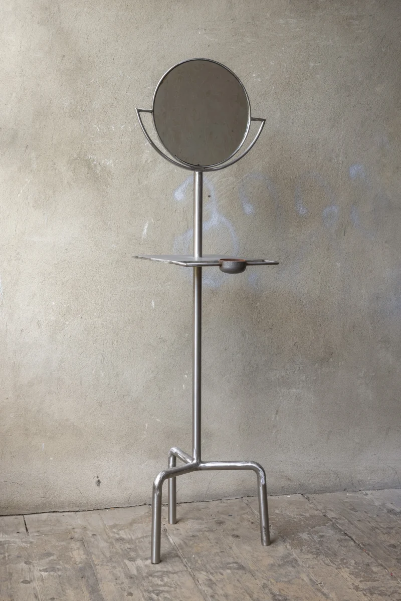 The Standing Mirror is made entirely from stainless steel. It has a fixed structure and is not disassemblable.