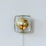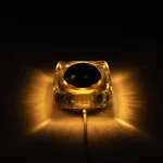 Inspired by a simple squish of clay and the subtle glow of starlight, the cast-glass form features gently pinched contours and a spun brass dome that eclipses the warm LED core. The dome reflects back light as bit bounces through the translucent, candy-like glass, producing stellar optical patterns.