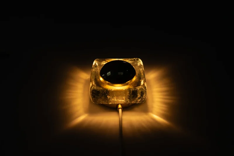 Inspired by a simple squish of clay and the subtle glow of starlight, the cast-glass form features gently pinched contours and a spun brass dome that eclipses the warm LED core. The dome reflects back light as bit bounces through the translucent, candy-like glass, producing stellar optical patterns.
