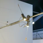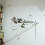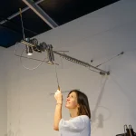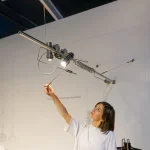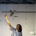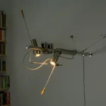 This sculptural piece from Polish studio, Szostak Atelier, features a 2-meter-long arm crafted from premium stainless steel, showcasing elements of Neo Industrial design. The spotlights, positioned on a mobile bogie, offer versatile illumination with the ability to point in two different directions. They are complemented by handles in warm wood finish.