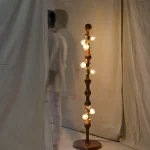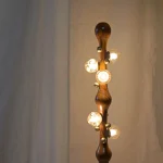 The Stem Floor Lamp by Studio Indigene captivates with its understated elegance and minimalist design. Its soft, warm light emanates from bulbous amber-tinted glass globes, creating a gentle glow that beautifully complements the natural richness of the wood. The carefully crafted wooden body takes center stage, showcasing its organic profile and intricate grain. Each piece celebrates natural materials and craftsmanship.