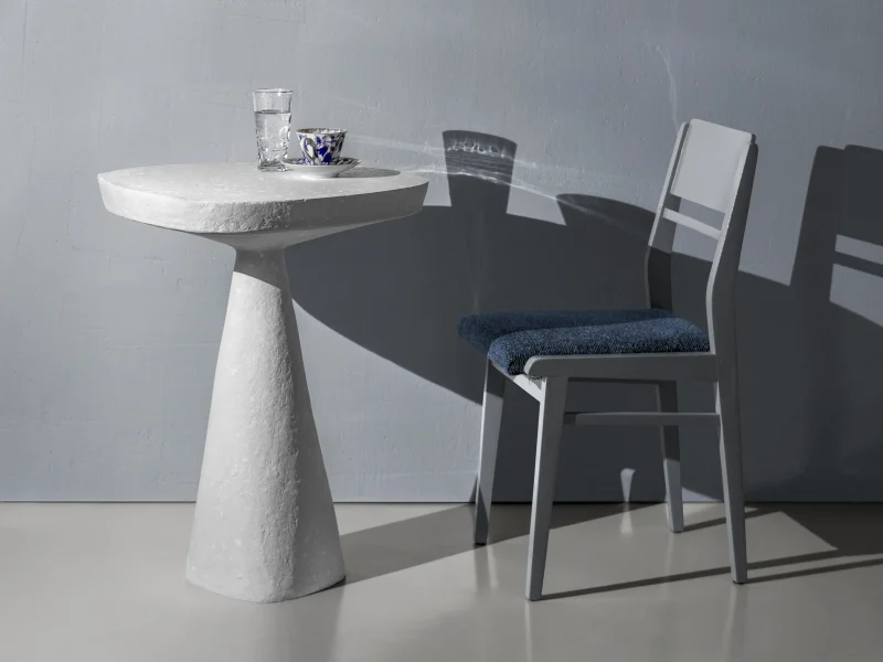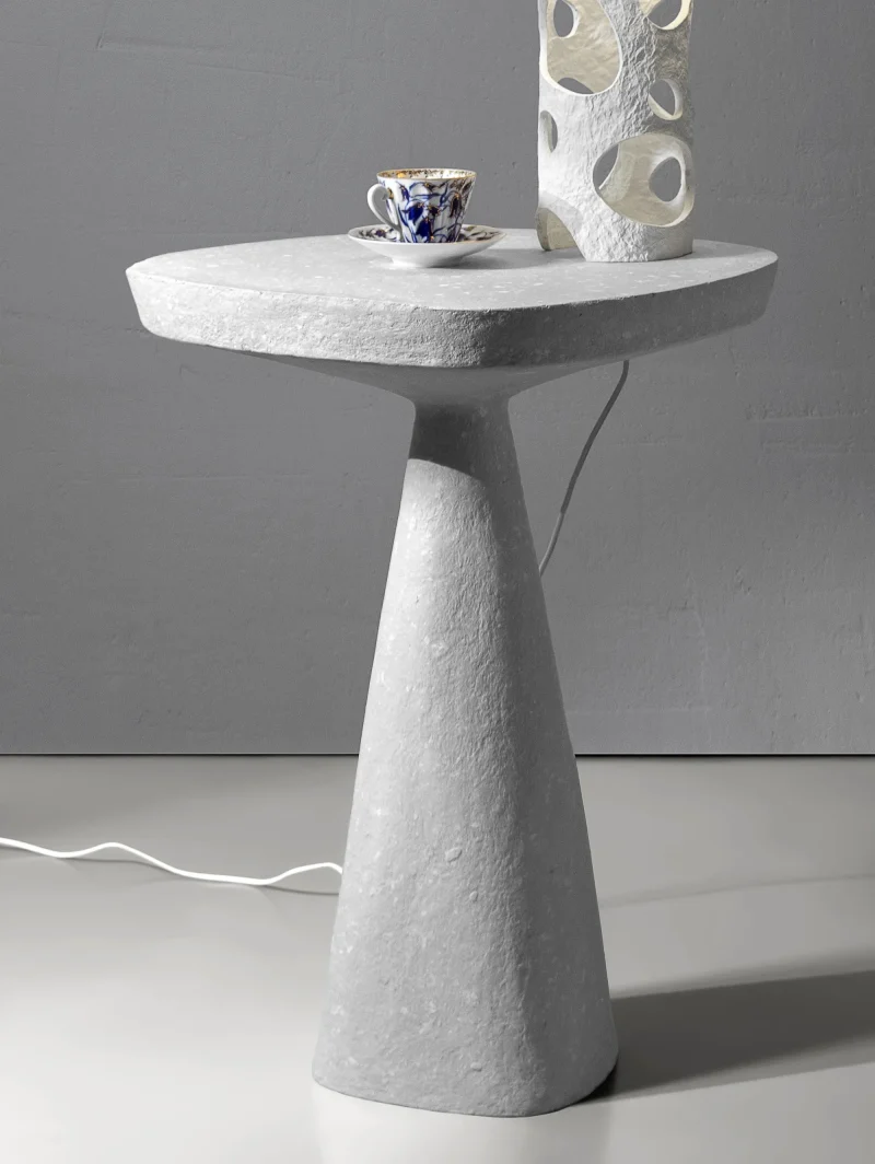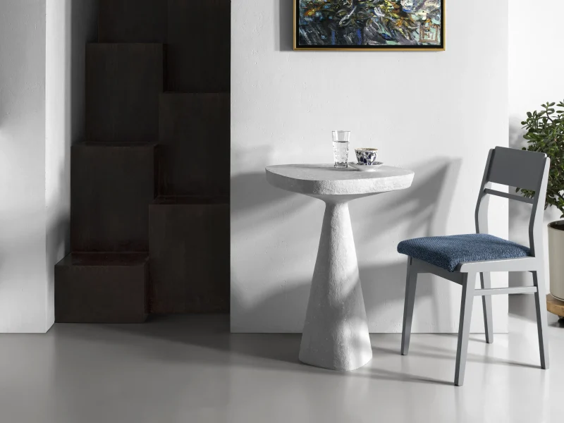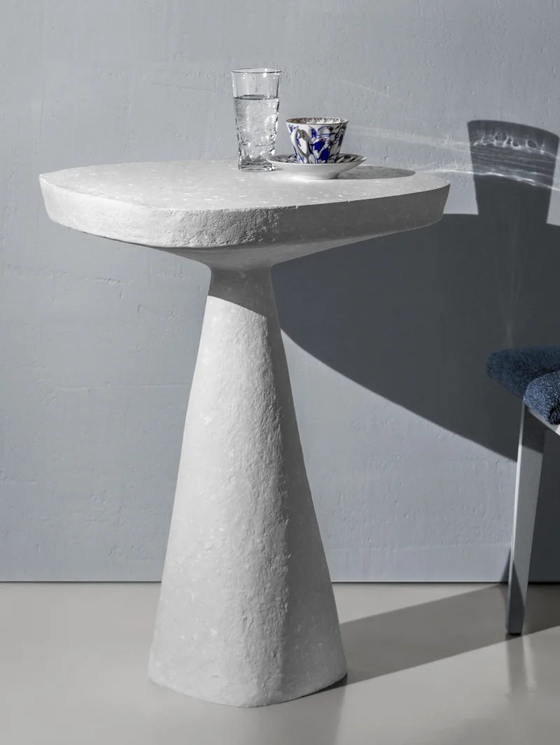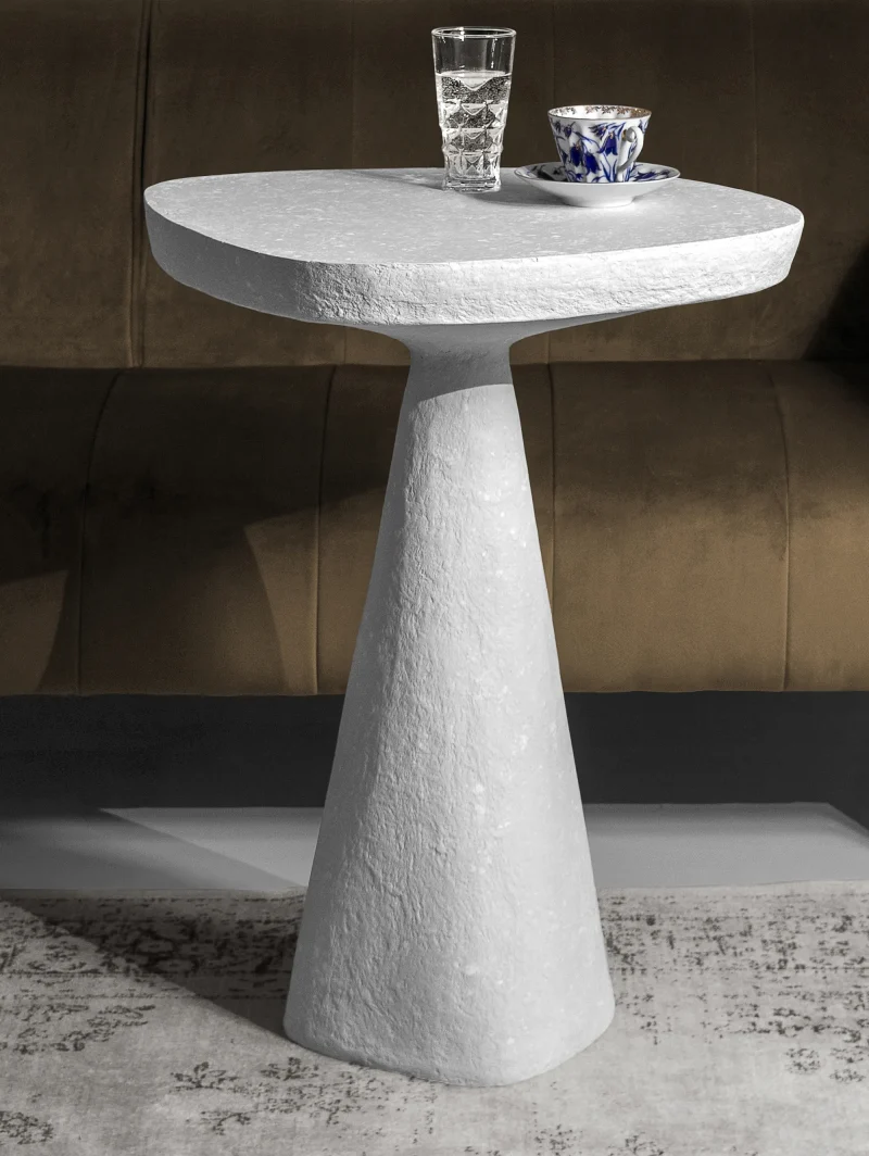 This minimalist table combines simplicity and elegance with its sculptural design and natural material texture. Crafted from a stone-like composite and concrete, it features a raw, organic aesthetic perfect for contemporary or industrial interiors.