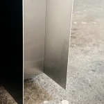 Made from 2 mm thick brushed stainless steel plates, the table has a precise silhouette defined by the free-standing, slender leg plates, which offer a sculptural presence and visual lightness at the same time.