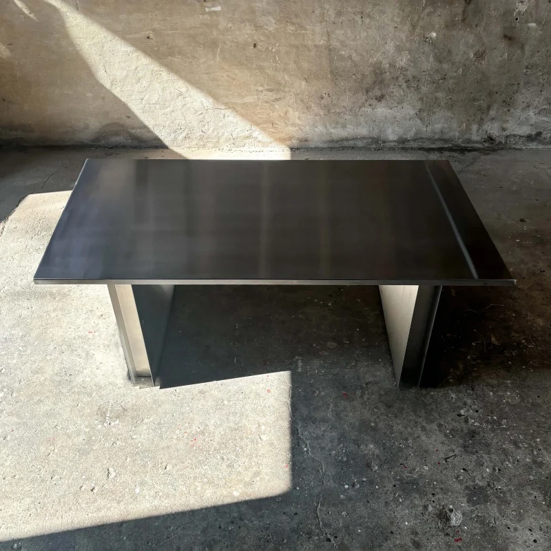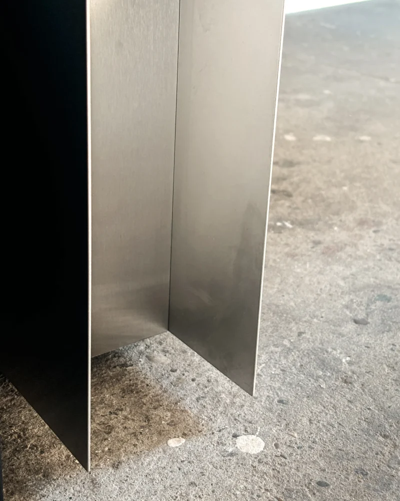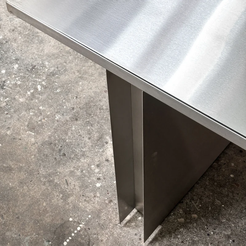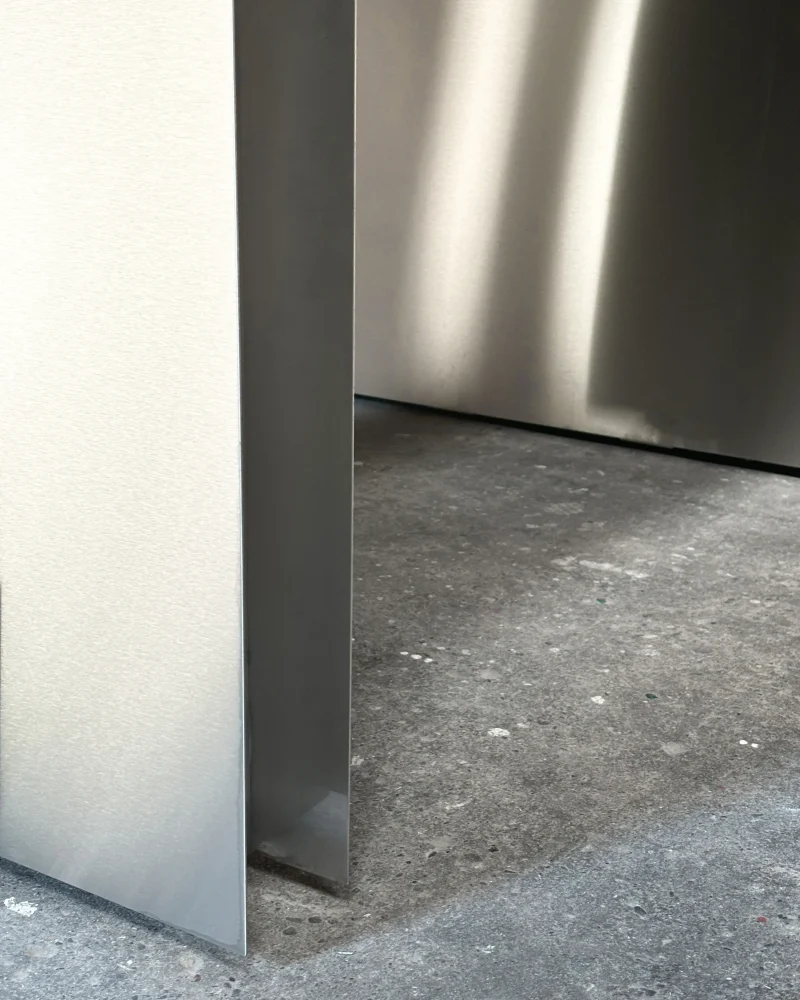Made from 2 mm thick brushed stainless steel plates, the table has a precise silhouette defined by the free-standing, slender leg plates, which offer a sculptural presence and visual lightness at the same time.