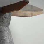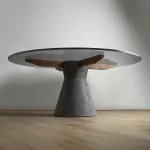 Our Stricta dining table features a design with simple yet striking lines, making it the perfect choice for various settings, whether indoors or outdoors. Crafted with precision, the volcanic stone monolith base serves as a connecting point for its top. Two solid wood crossbars and a circular surface of smoked laminated glass combine to create a visually stunning piece. Every detail of the Stricta table adds charm and warmth to the ensemble, from the unique marks and textures of the volcanic stone to the natural grain of the solid wood.