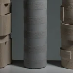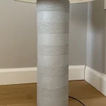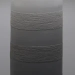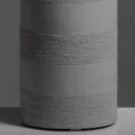 Inspired by the depth and versatility of grey, this lamp by Katia Langeard is a study in rhythm and texture. The artist sought to achieve a perfect balance through alternating strips of raw clay in light grey sandstone color. The result is a refined yet understated piece—simple, luxurious, and elegant. Topped with a softly woven shade, the lamp diffuses a warm, inviting light, making it a sophisticated addition to curated interiors. Designed for collectors who appreciate craftsmanship and materiality, this piece seamlessly blends contemporary minimalism with timeless artistry. Height of ceramic base: 38 cm. 35/35/20 cm fabric lampshade in off-white