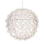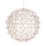 Big but lightweight and transparent lamp “made of air”. A large ball (dia. 100cm), made of luminous grapes, suspended on a stainless steel construction. SUPERSTAR by PUFF-BUFF is made of 150 flexible, air-filled parts in transparent electronically welded PVC with LED light-points (Bubbles® system developed by PUFF-BUFF). Because of its feather weigh (just 8 kg) the lamp can decorate a variety of interiors, even those with delicate ceiling structure. Bubbles® elements with their shiny surfaces reflect the light and the ambient colors. High-quality material contains a UV filter for long-lasting protection of transparency.