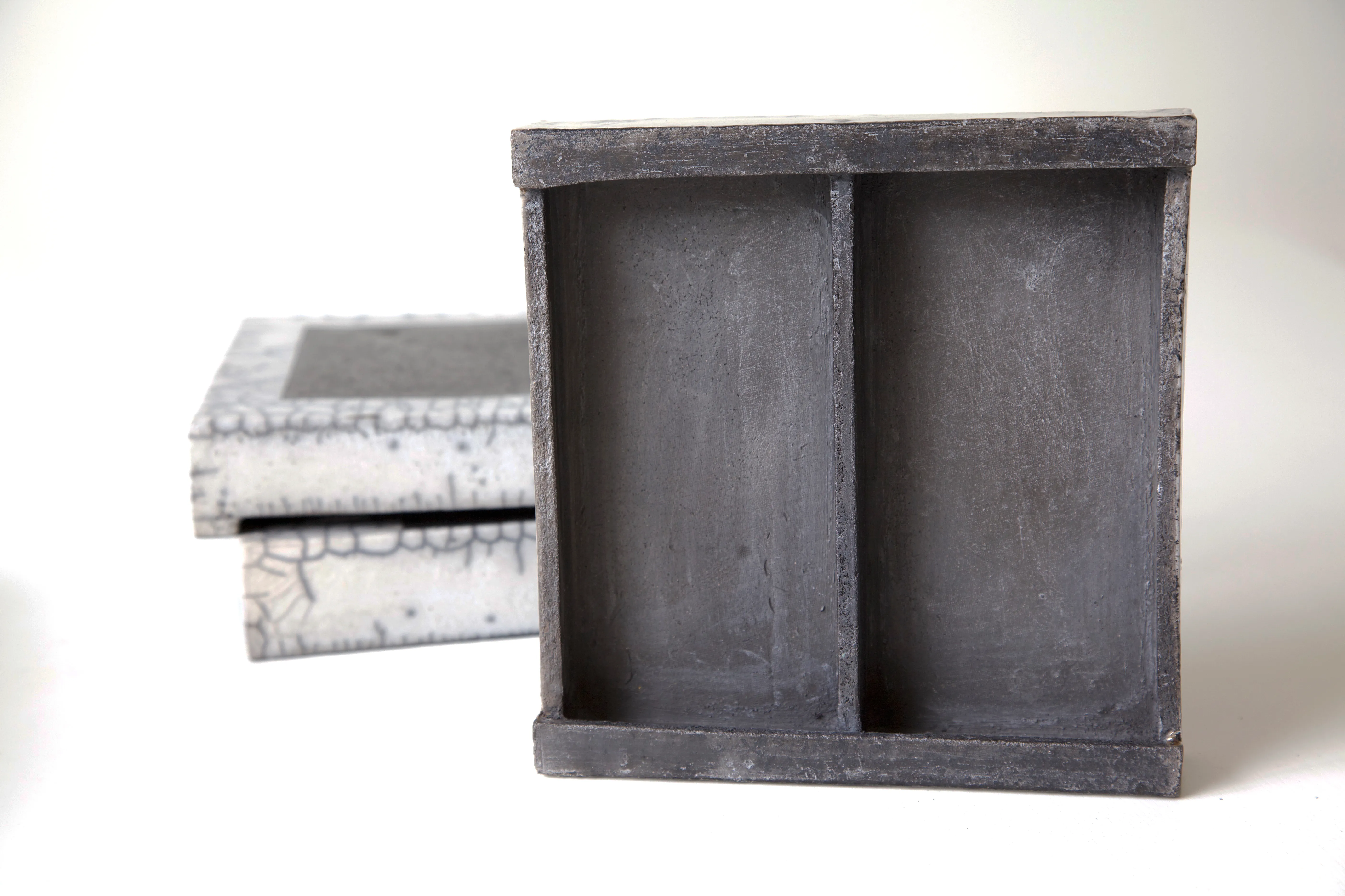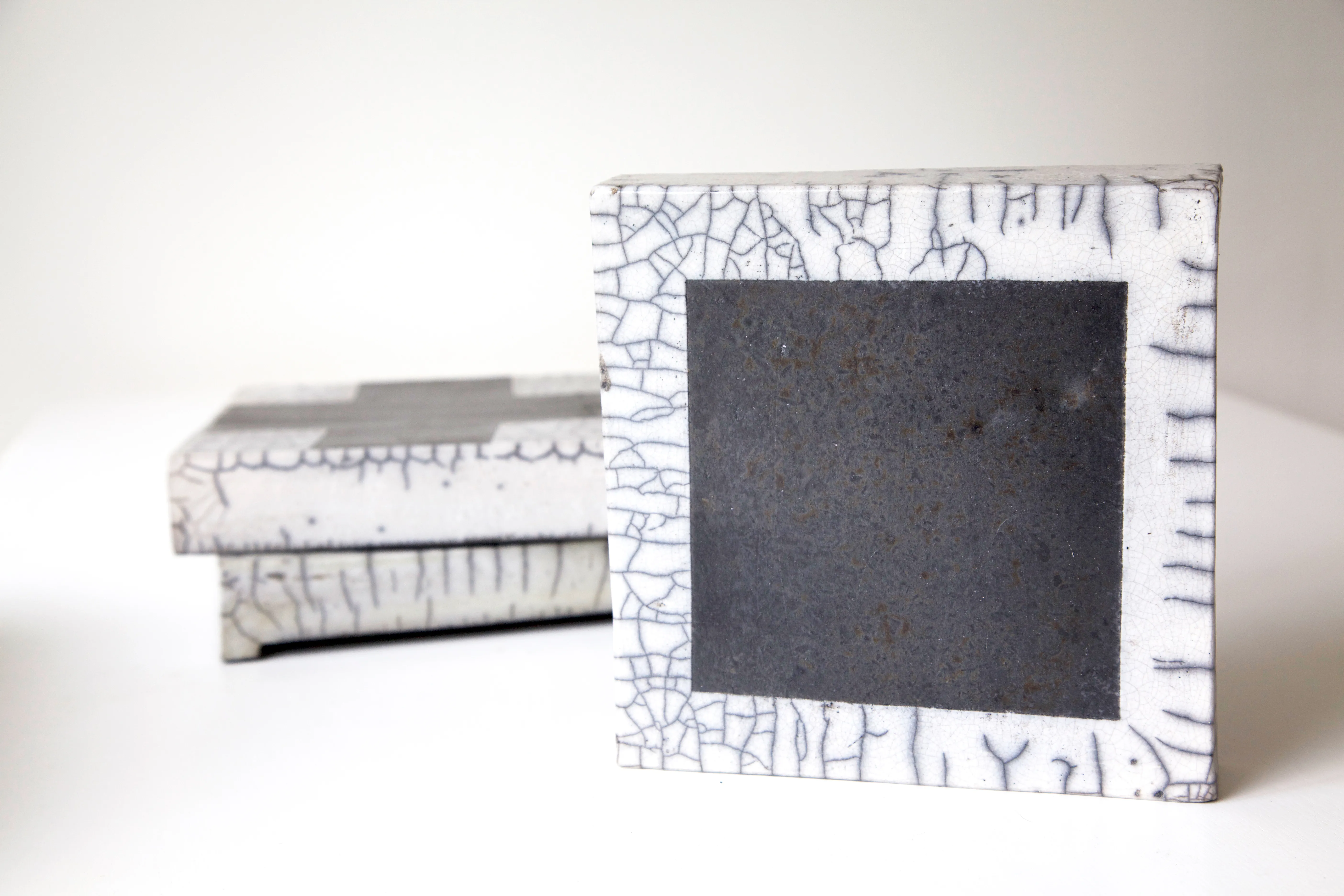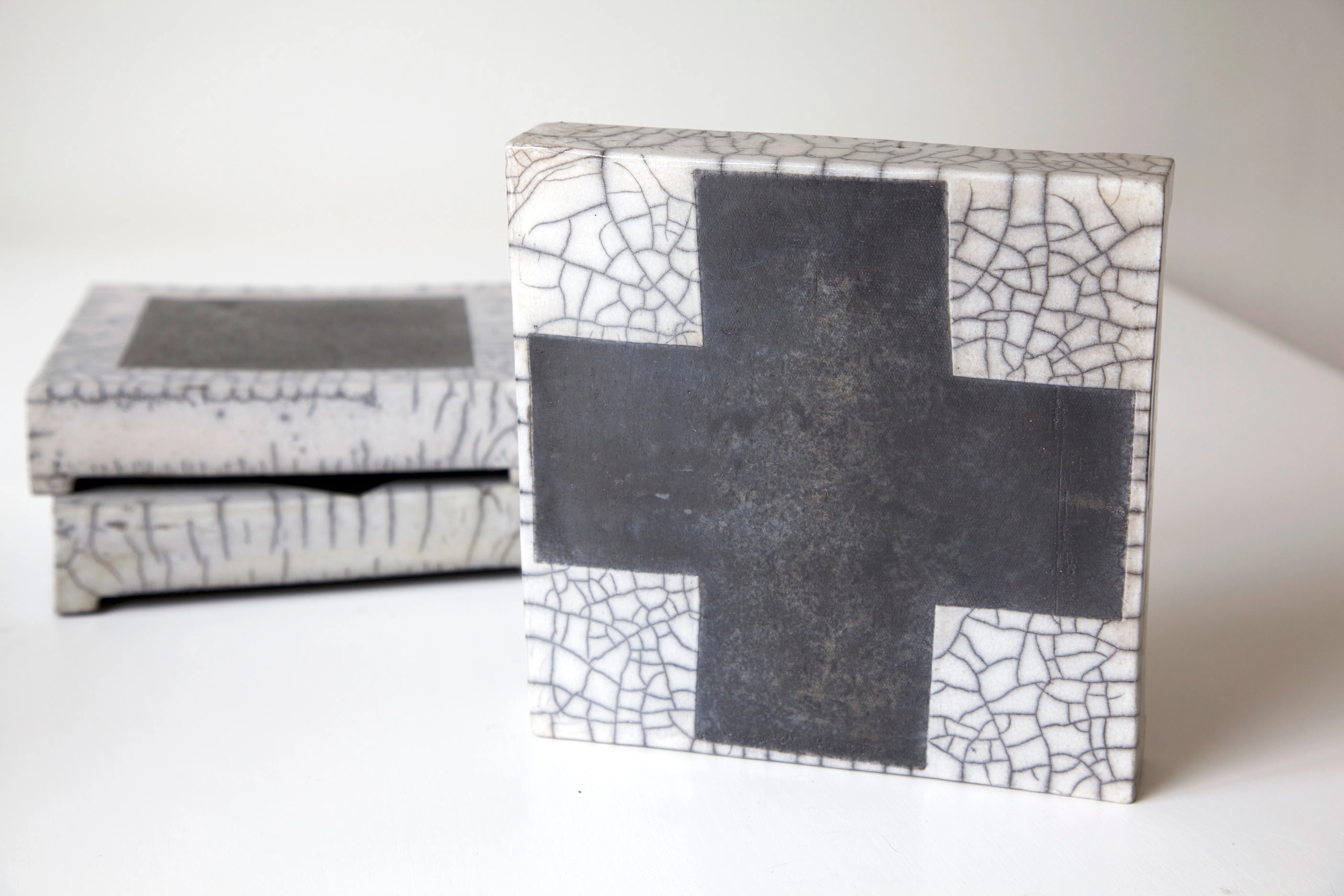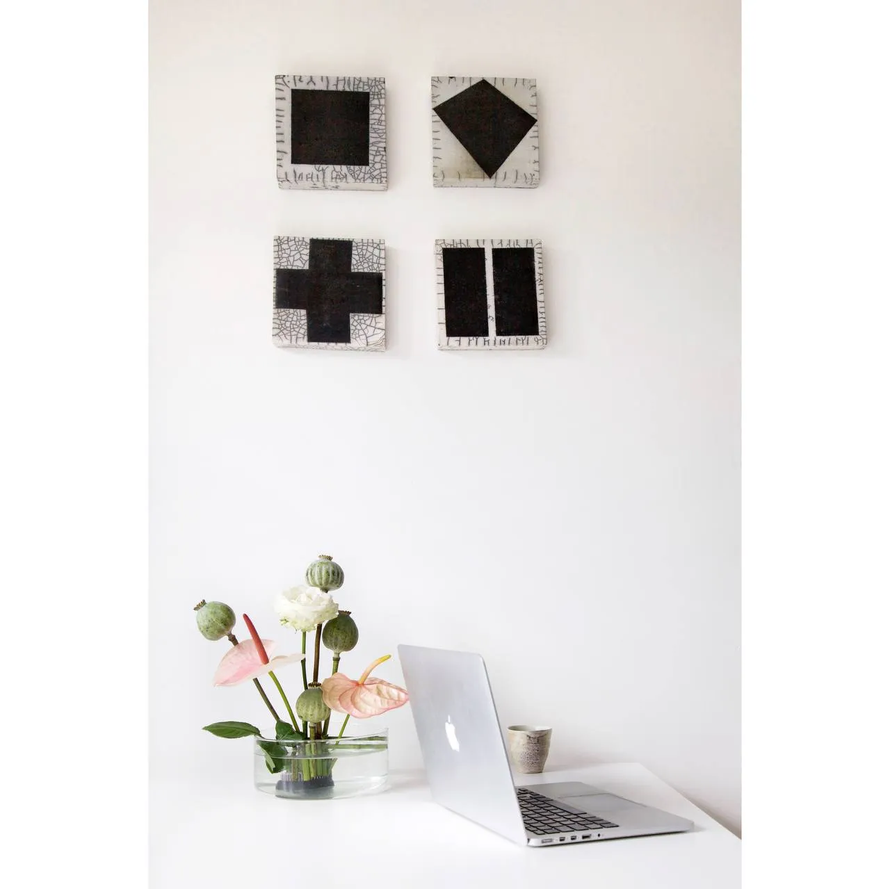 “Suprematist Four” is a series of four ceramic wall pieces inspired by the formal vocabulary of Suprematism. A square, a diamond, a cross, and a pair of rectangles – each tile features a singular black form, emerging from a smoky white background, rich with raku crackles and burn marks.