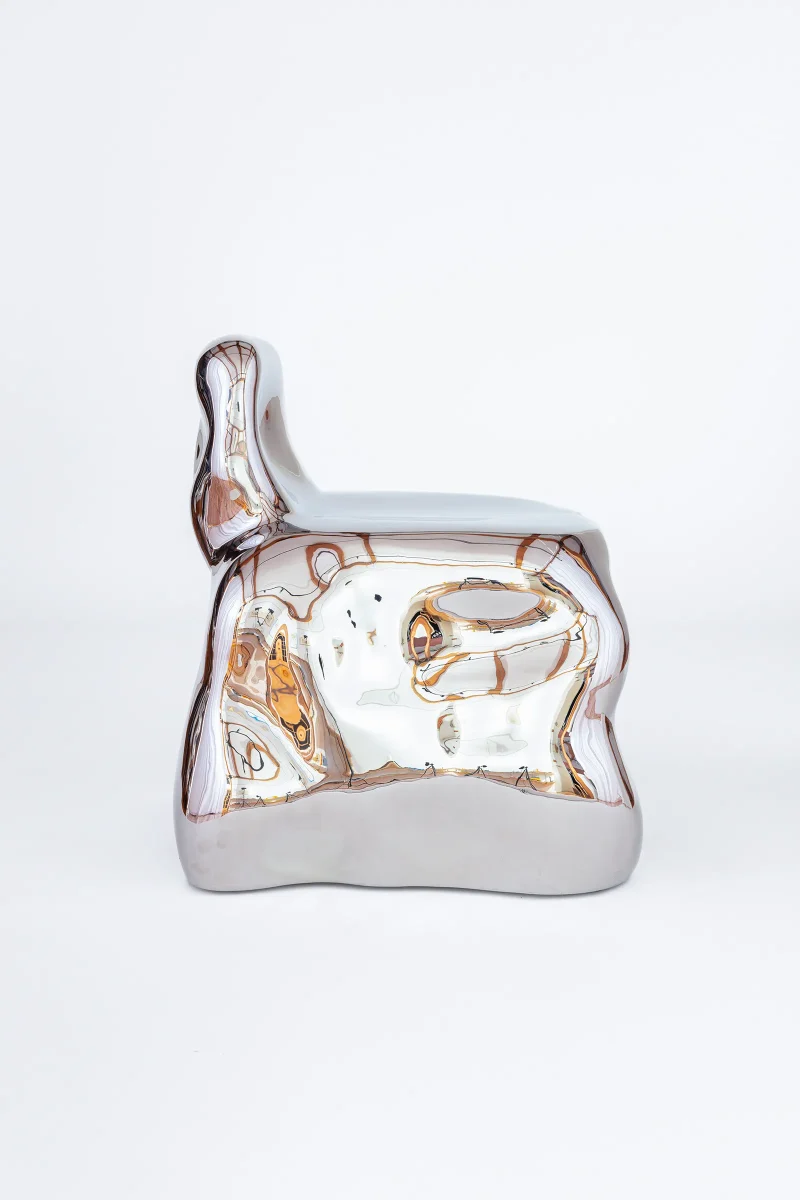 Rooted in Baroque calculus, which conceived time and space as smooth and continuous, the chair draws from the era’s pursuit of an idealized material—one that was isotropic, uniform, and seamless. Stainless steel, developed in the 19th century, comes closest to realizing this theoretical perfection, embodying the smoothness and homogeneity once imagined but never attained. Today, digital modeling carries forward this legacy, manipulating infinitely pliable abstract surfaces, much like those envisioned in Baroque mathematics.