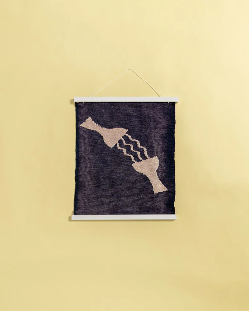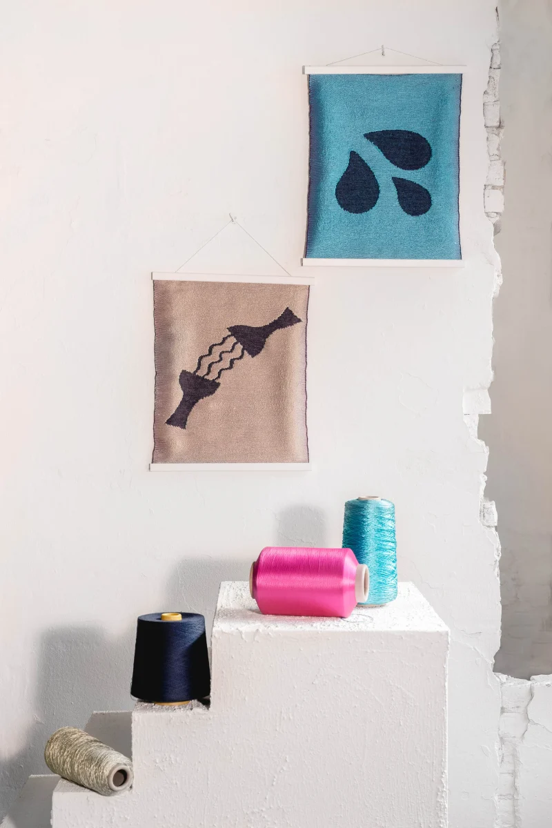 Suspended in a wooden magnetic frame, this textile wall piece captivates with its shiny, colour-changing surface and woven-like optic, achieved through a unique yarn inlay technique. Inspired by the “Temperance” tarot card, the design reflects playfulness, movement, and harmony, making it a modern addition to any home decor collection.