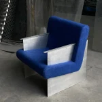 The armchair combines felt with aluminum sheets. The metal construction is inserted into the cut of the upholstered part, creating a unique assemblage where soft and hard materials meet. This direct a