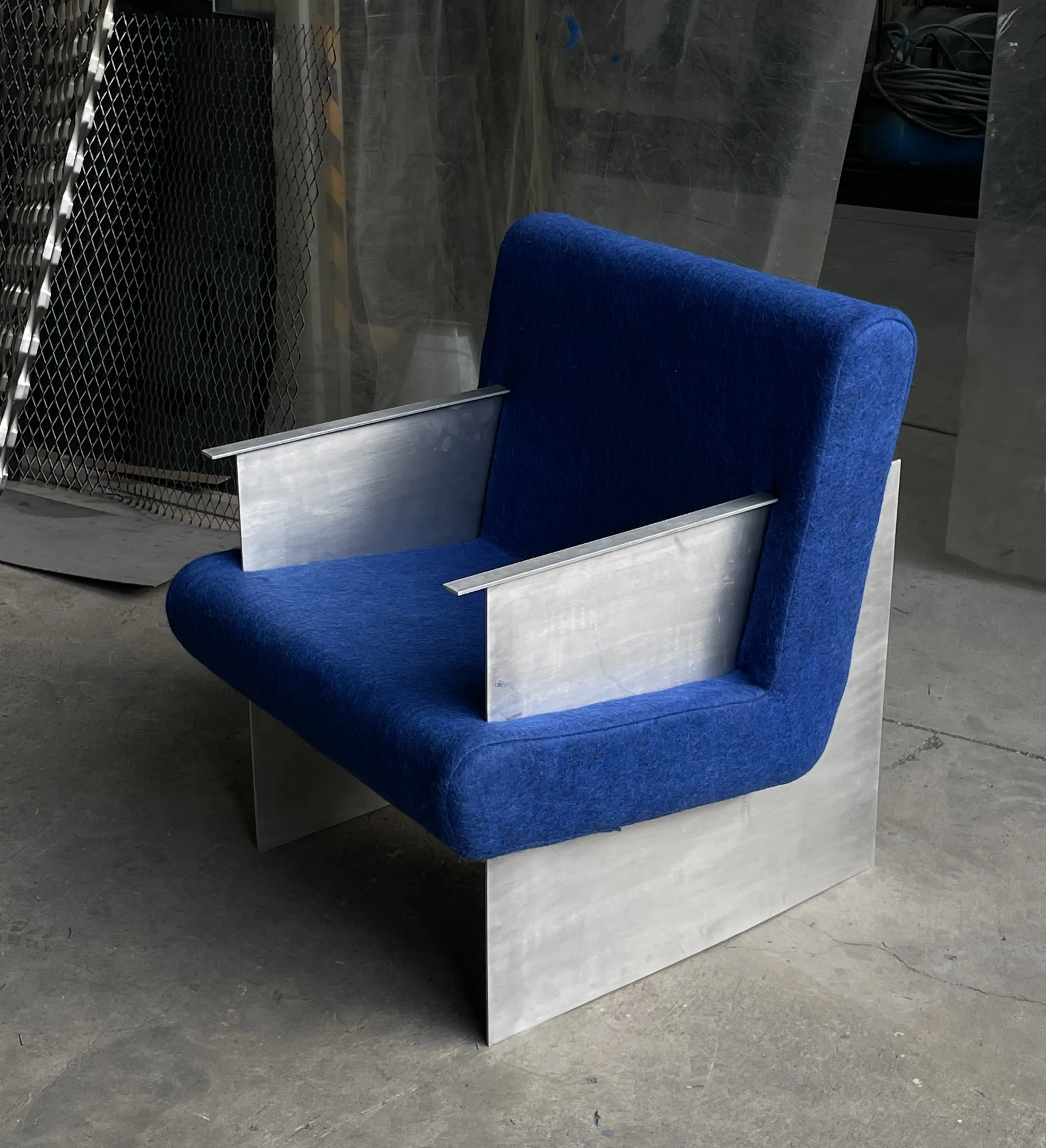 The armchair combines felt with aluminum sheets. The metal construction is inserted into the cut of the upholstered part, creating a unique assemblage where soft and hard materials meet. This direct a