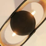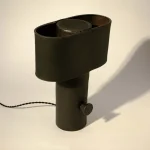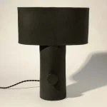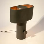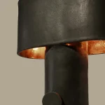 The top section forms a shade with two openings on either side, creating pockets for the light to emit upwards and downwards for a subtle and diffused illumination. The inside of the elliptical top is finished with a warm, metallic bronze coating which is enhanced by the glow of the light and further contrasts the dark, textural exterior glaze.