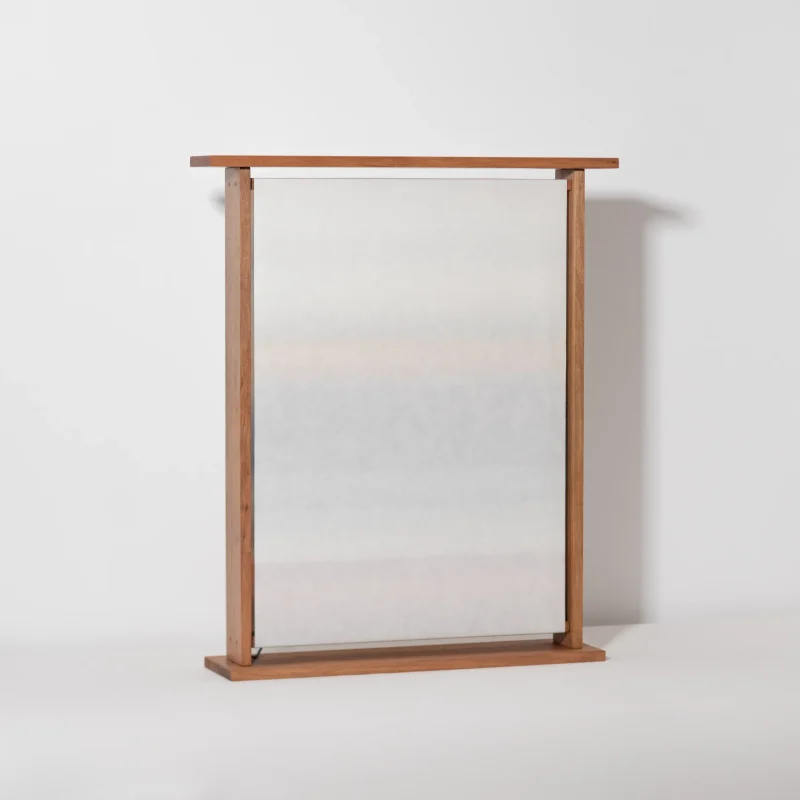 Within a crafted walnut frame, two landscapes overlap.