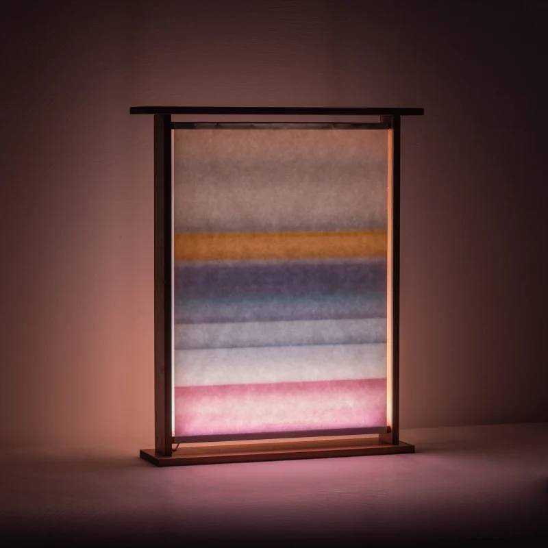 One gradually reveals itself, while the other shimmers through, softly diffused by light, casting its colorscape into the surrounding space.