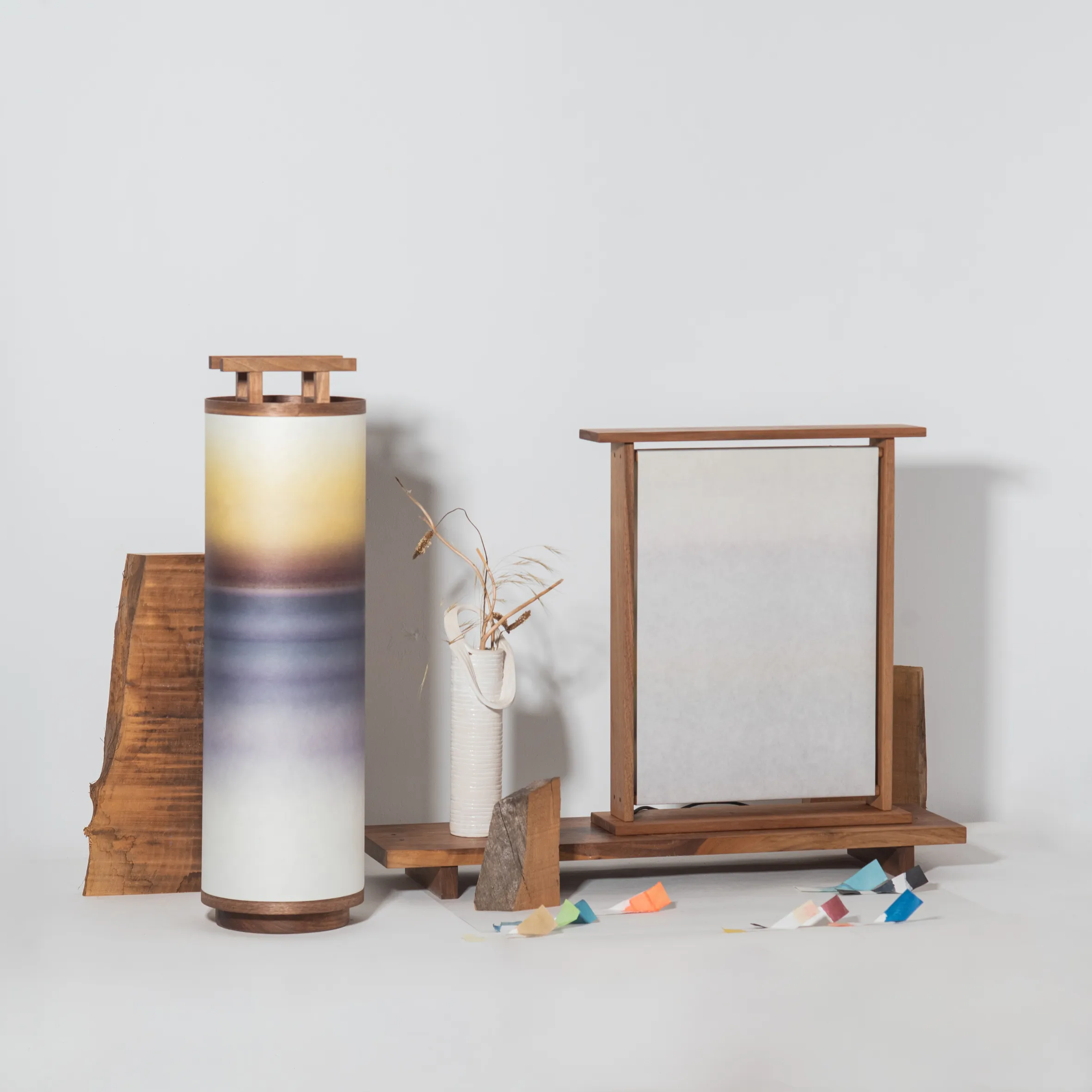 ambient interior lighting Ambient lighting Andon lamp architectural opening calm atmosphere Candy Design color projection colorscape contemplative home decor contemporary lantern Cozy Living cylindrical landscape lamp Design for Doing Less Design object designer tabletop lamp diffused glow lamp diffused light handmade artisanal lamp horizon horizon layers Japanese aesthetic Japanese culture of light Japanese-inspired lamp Japanese-inspired lighting layered landscapes light dialogue material warmth meditative lighting design Mid Century Modern Mid Century Modern Living Room Minimal design overlapping forms poetic light ritual object Sculptural lamp serene lighting seuil light shimmering surface soft glow spatial threshold spiritual home accessories torii TORII lamp traditional Japanese furniture inspiration walnut core lamp walnut frame washi paper lamp washi paper table lamp