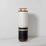 Two washi paper cylinders gently wrap around a walnut structure, enlighting a vibrating horizon seen through a Torii gate.