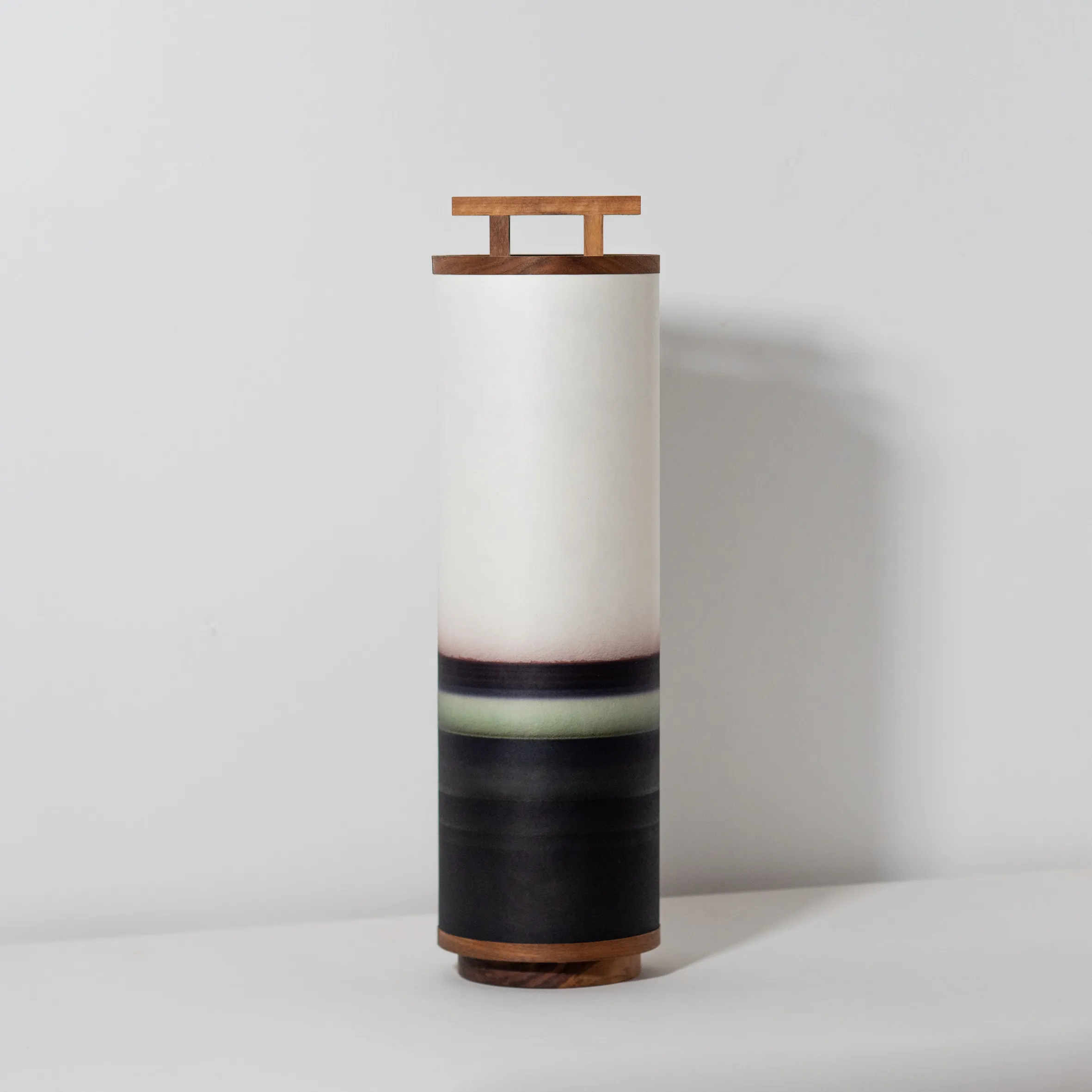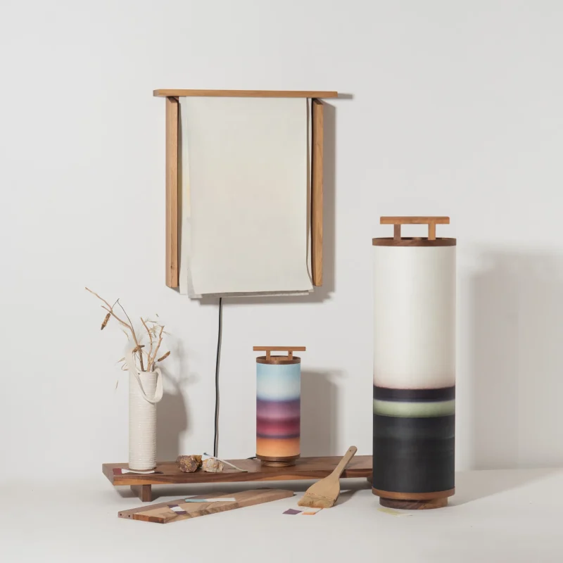 Two washi paper cylinders gently wrap around a walnut structure, enlighting a vibrating horizon seen through a Torii gate.