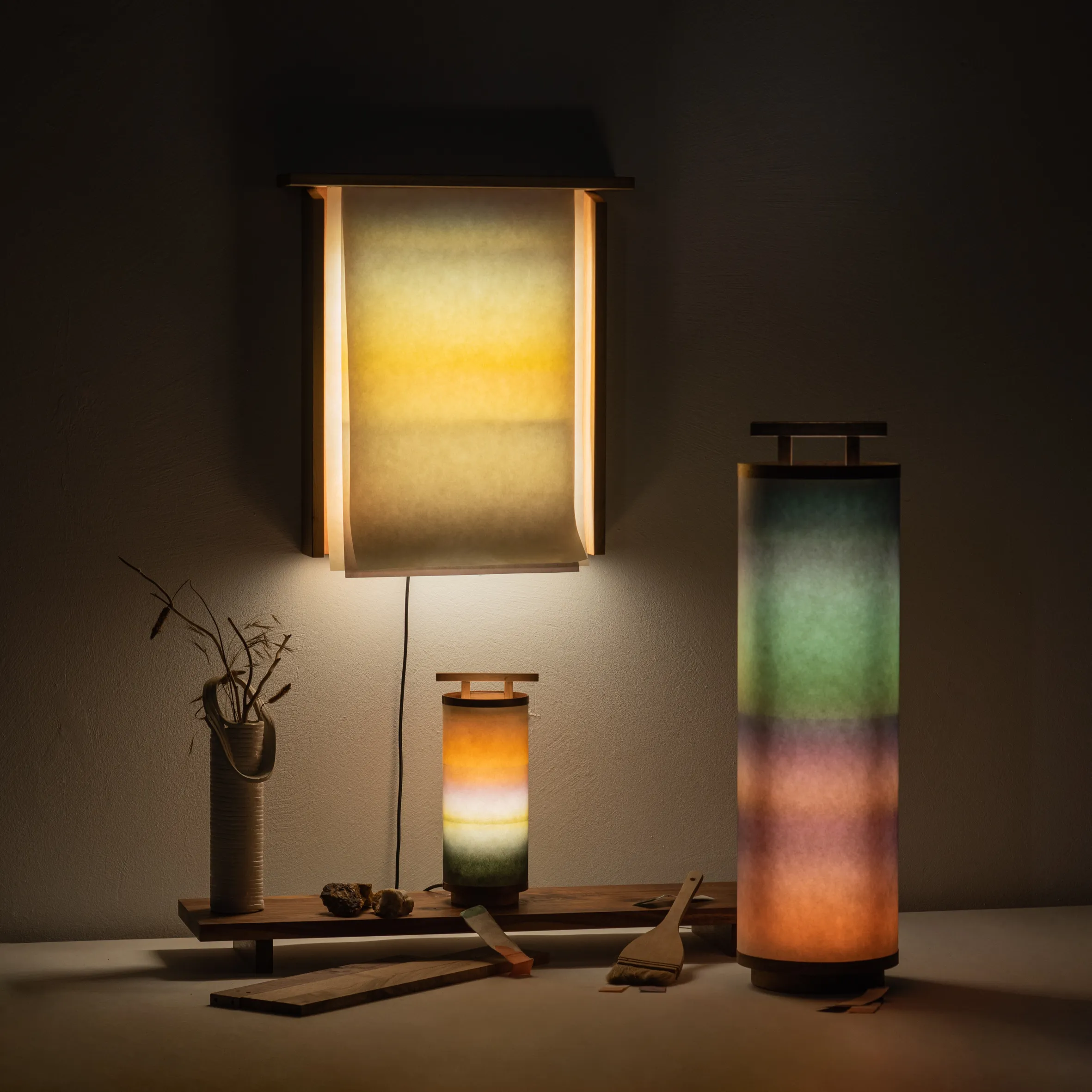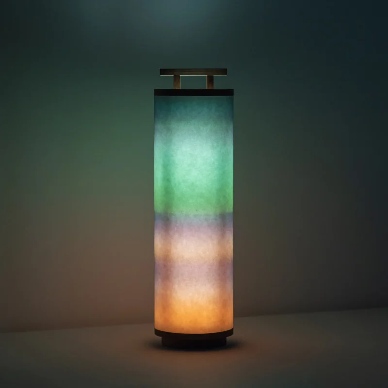 ambient interior lighting Ambient lighting Andon lamp calm atmosphere Candy Design color revealing colorscape contemplative home decor contemporary lantern Cozy Living cylindrical landscape lamp day night lamp Design for Doing Less designer tabletop lamp diffused glow lamp handmade artisanal lamp horizon horizon glow Japanese culture of light Japanese Inspired japanese lantern Japanese-inspired lamp Japanese-inspired lighting meditative lighting design Mid Century Modern Mid Century Modern Living Room paper cylinders poetic lighting ritual light Sculptural lamp serene light soft radiance spiritual home accessories tabletop lantern tactile paper torii torii gate TORII lamp traditional Japanese furniture inspiration walnut core lamp walnut frame warm illumination washi paper washi paper lamp washi paper table lamp wooden structure zen design