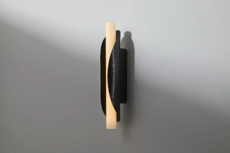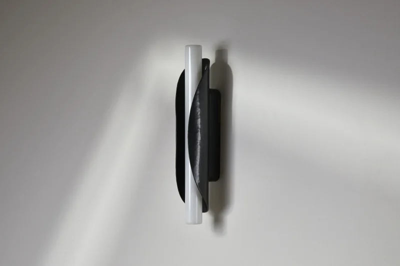 The soft curvature of the rolled metal both conceals and accents the light source, resulting in a wall fixture that is interesting even when it’s not lit. When illuminated, the concave interior glows brilliantly and the negative space between the two ends of the ‘taco’ is activated. When switched off, the object acquires a more sculptural character thanks to its vertical, tubular shape and the convex surfaces of its two wings that catch and reflect light from their surroundings.