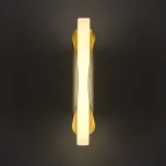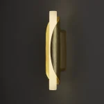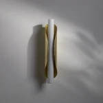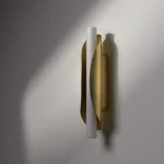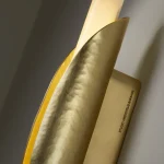 The soft curvature of the rolled metal both conceals and accents the light source, resulting in a wall fixture that is interesting even when it’s not lit. When illuminated, the concave interior glows brilliantly and the negative space between the two ends of the ‘taco’ is activated. When switched off, the object acquires a more sculptural character thanks to its vertical, tubular shape and the convex surfaces of its two wings that catch and reflect light from their surroundings.