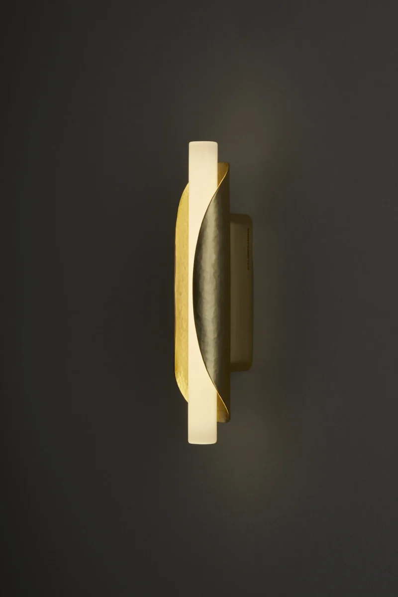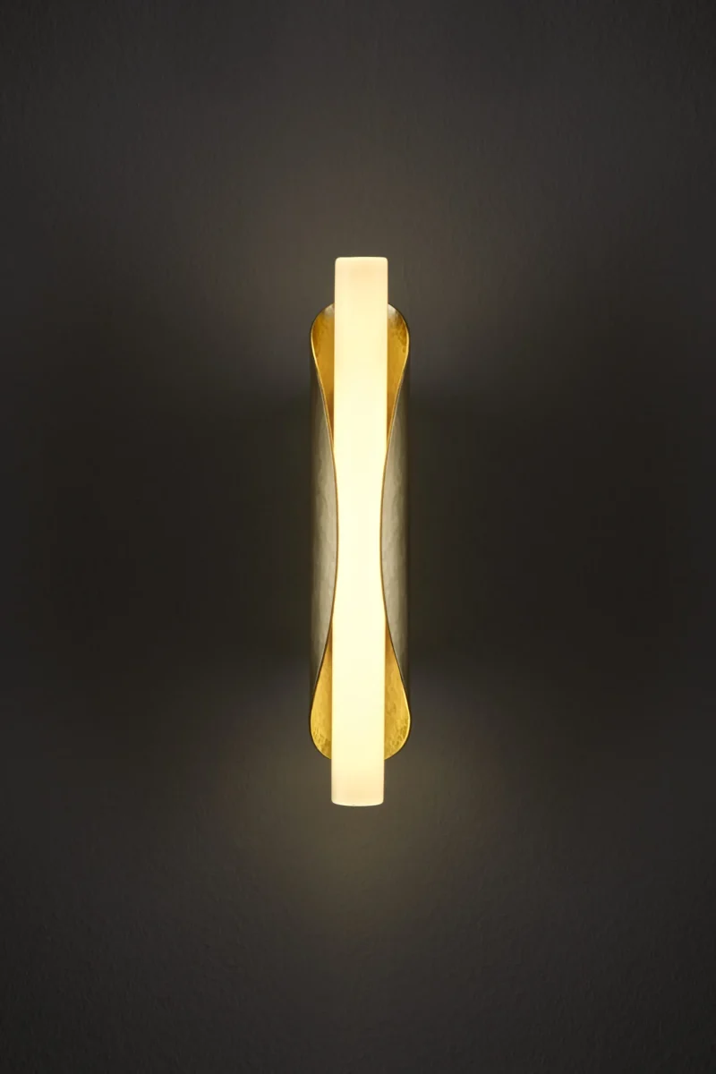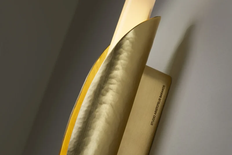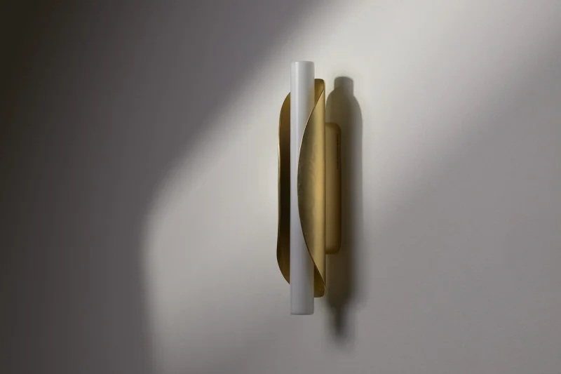 The soft curvature of the rolled metal both conceals and accents the light source, resulting in a wall fixture that is interesting even when it’s not lit. When illuminated, the concave interior glows brilliantly and the negative space between the two ends of the ‘taco’ is activated. When switched off, the object acquires a more sculptural character thanks to its vertical, tubular shape and the convex surfaces of its two wings that catch and reflect light from their surroundings.