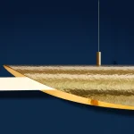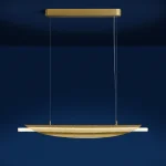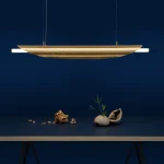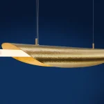 Taco de Luz Grande takes this concept to a new scale and allows top-down illumination as an elegant pendant light. Its minimalist form commands attention whilst retaining a refined profile, and the hand-hammered reflector sheet allows for very soft and wide diffusion. The object’s dynamic curvature creates an interesting sense of movement and lightness, as if floating in space. This pendant light is ideal for dining tables and restaurants, as well as receptions, work desks and other scenarios that call for concentrated, soft illumination without visual distractions.