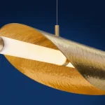 This is a new addition to the Taco de Luz lighting collection, which takes its fanciful name from its particular shape: an oval metal sheet that gently embraces and partly conceals the light source within. The main design idea is the contrast between the sleek tubular lightbulb and the handmade texture of the hammered metal that contains it, which creates a balanced interplay between smooth and indented surfaces, as well as linear and curved formal elements.