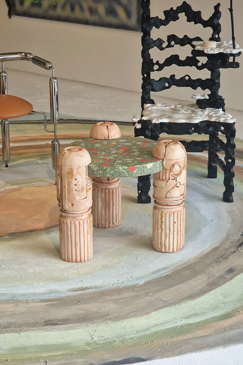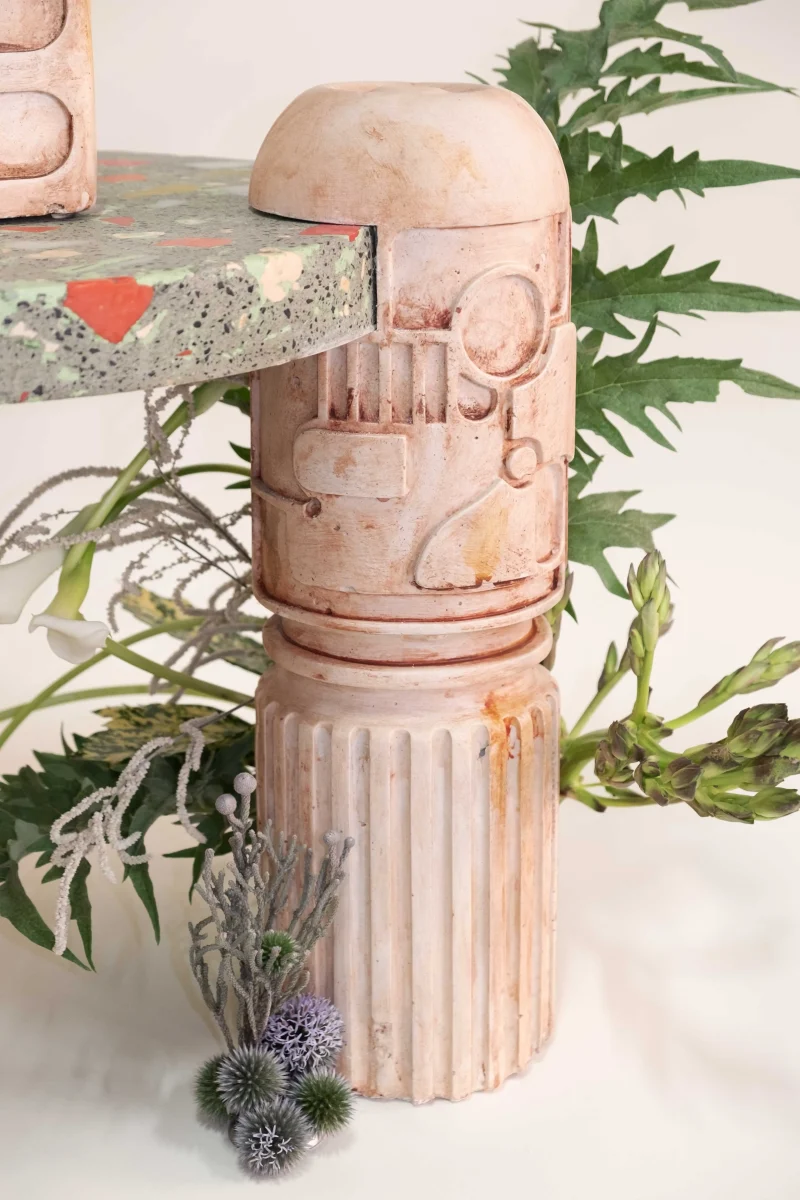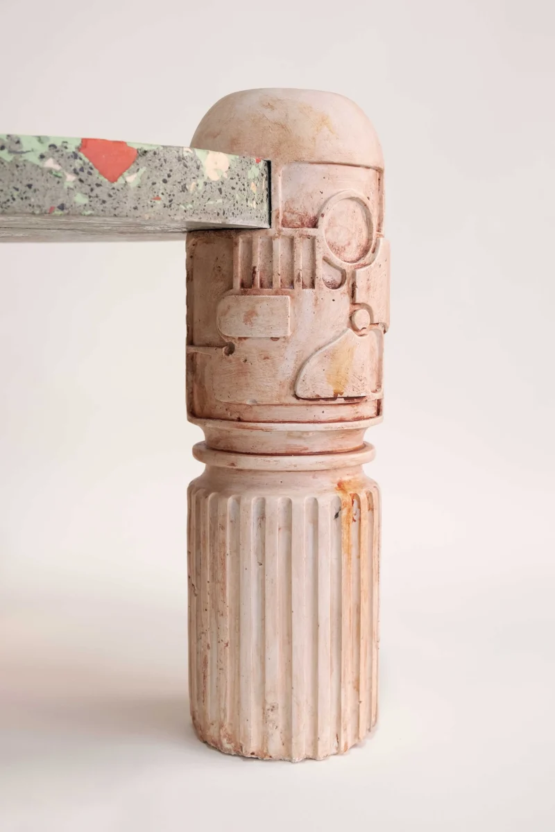The objects and furniture in the collection are artifacts of a technological world running on auto-pilot. A specially formulated plaster is the primary material, complemented by terrazzo, wood elements, and unique stoneware pieces.