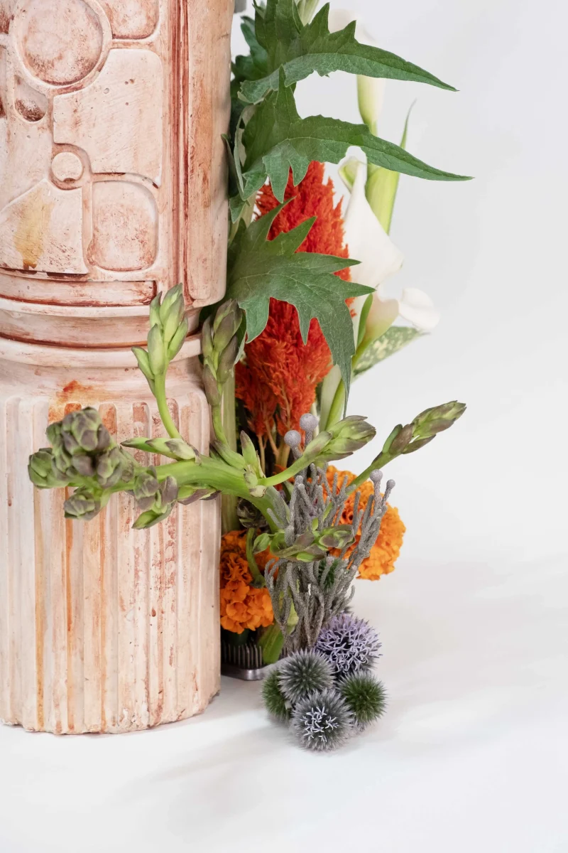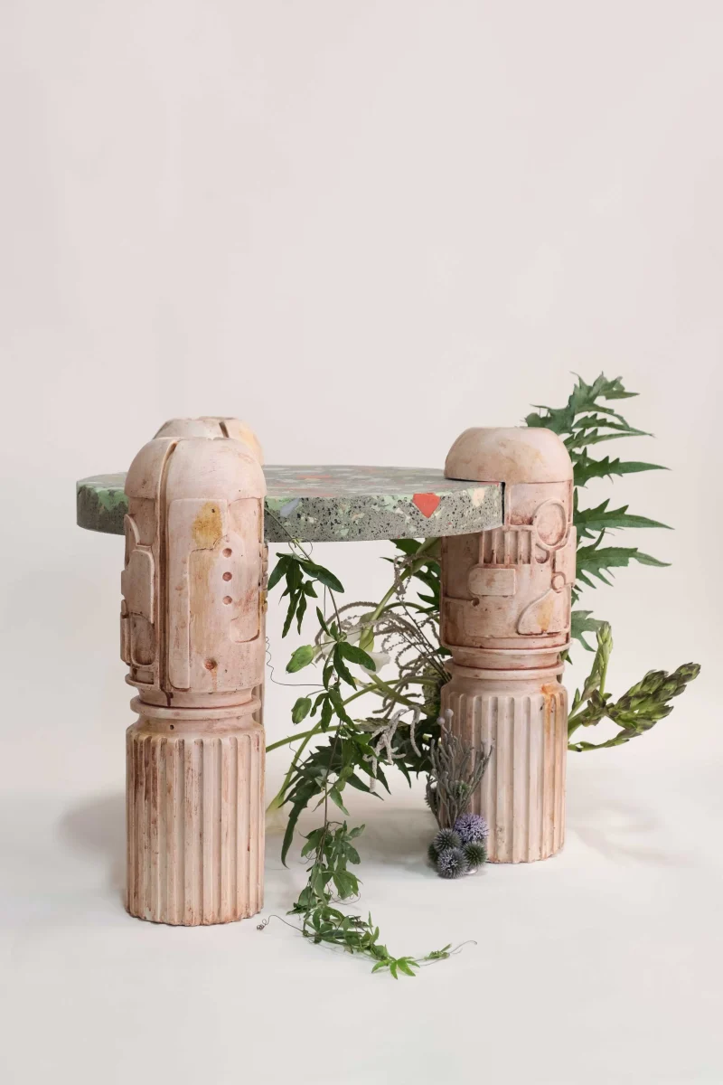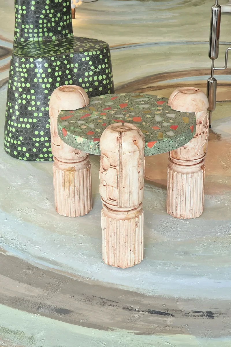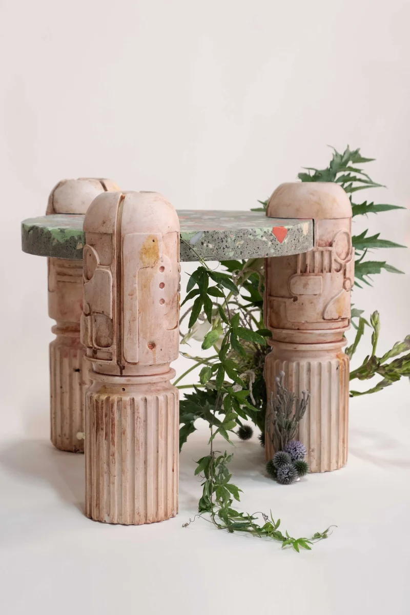 The objects and furniture in the collection are artifacts of a technological world running on auto-pilot. A specially formulated plaster is the primary material, complemented by terrazzo, wood elements, and unique stoneware pieces.